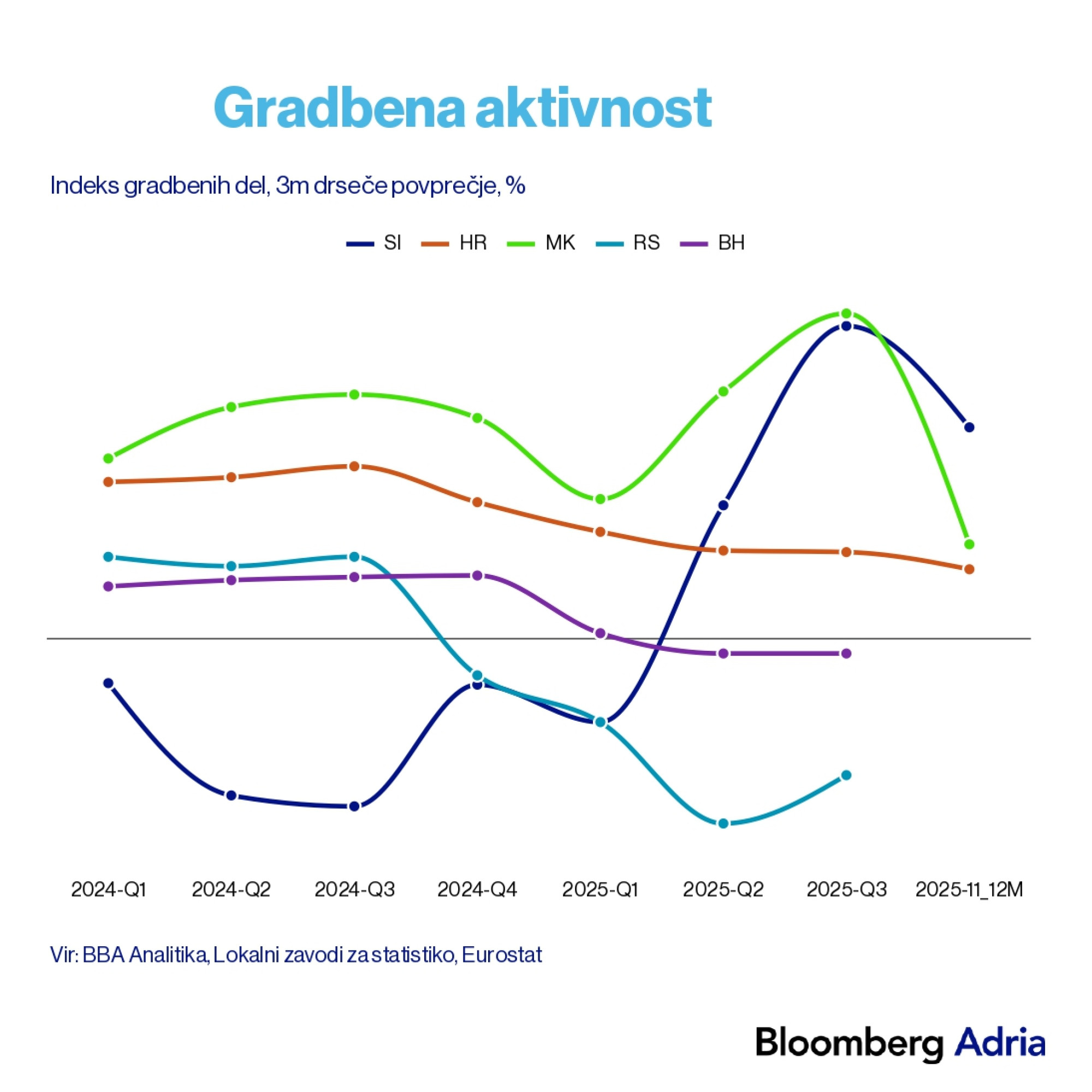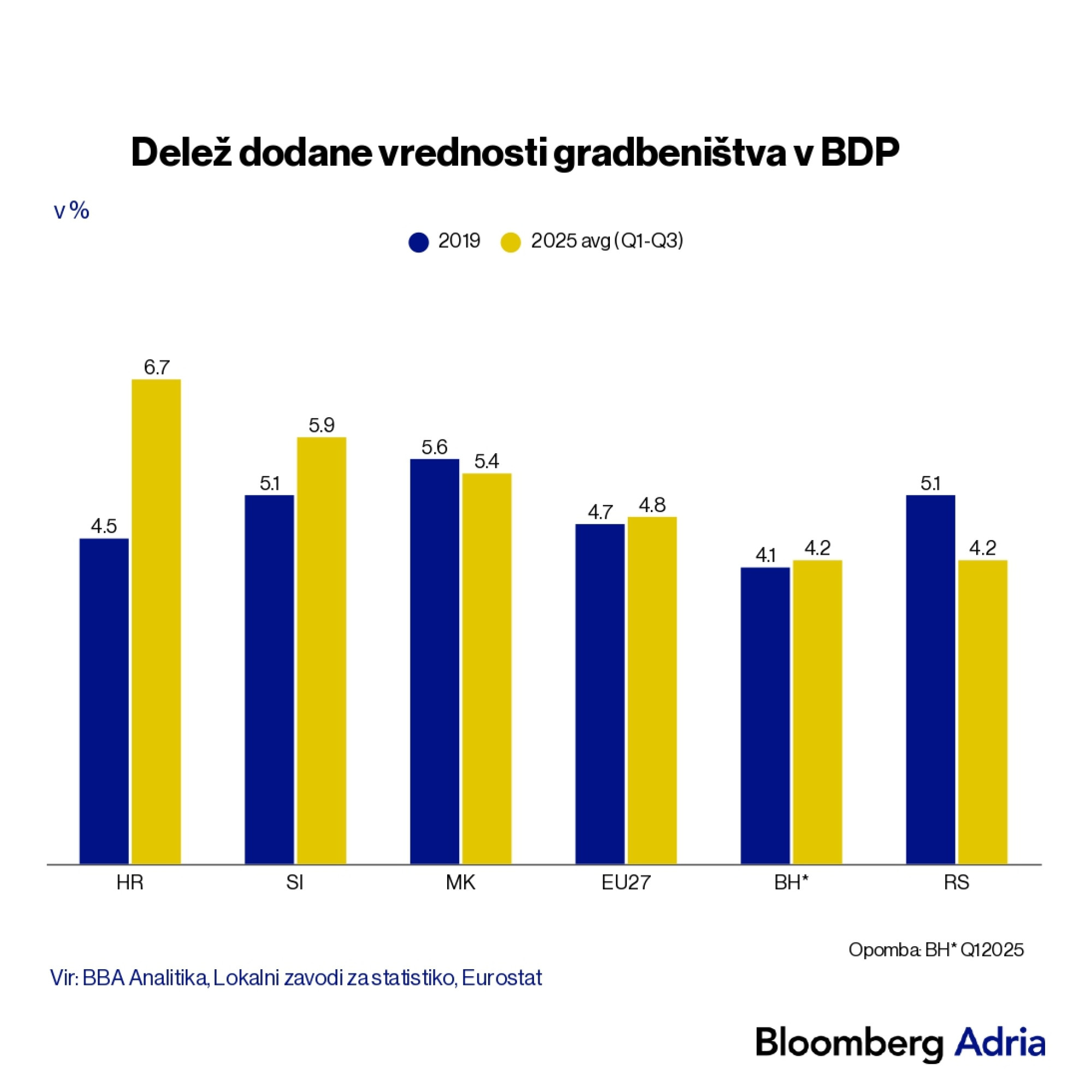 Rast v primerjavi z letom 2019 so zabeležili na Hrvaškem, v Sloveniji in BiH, medtem ko v Srbiji in Severni Makedoniji beležijo padec deleža gradbeništva. Srbija je imela v letu 2025 tri šibkejša četrtletja zaradi slabšega gospodarskega razpoloženja, medtem ko je v Severni Makedoniji v drugem in tretjem četrtletju že videno okrevanje v primerjavi s prvim četrtletjem prejšnjega leta.