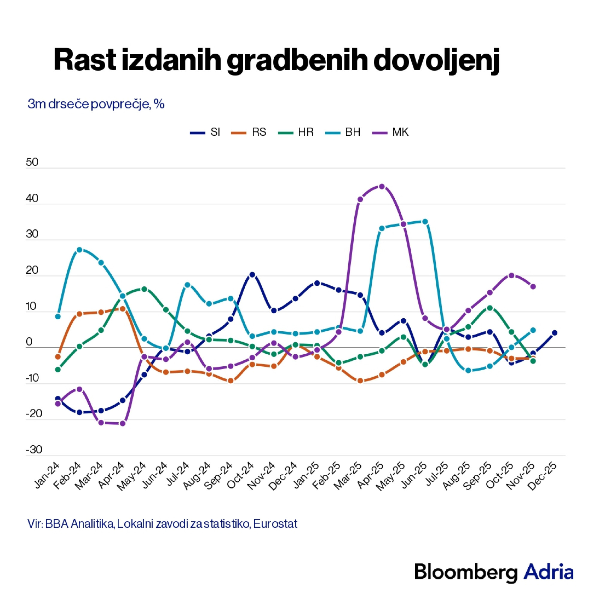 "Te številke potrjuje tudi gradbena aktivnost, ki je v pozitivnih okvirih (razen v Srbiji), medtem ko se je v BiH aktivnost v tretjem četrtletju 2025 upočasnila. Po drugi strani pa je prihodnjo rast gradbeništva mogoče spremljati prek novo izdanih gradbenih dovoljenj. Najbolj pozitivni trendi so v Severni Makedoniji, kjer so stopnje rasti dovoljenj visoke in dvomestne, kar dodatno prispeva k povečanju ponudbe nepremičnin in močnejšemu multiplikativnemu učinku na BDP. V 11 mesecih 2025 pa je le v Srbiji zabeležen padec števila dovoljenj," pojasnjuje Blažeković.