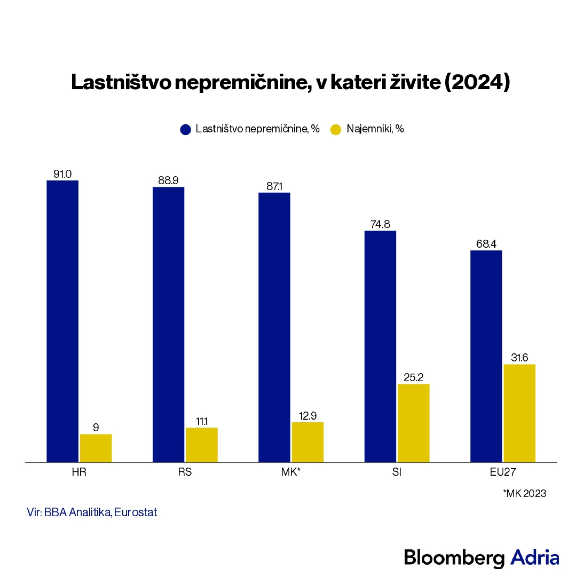 "Zaradi povpraševanja, rasti cen vhodnih materialov in stroškov dela v gradbeništvu so se cene nepremičnin občutno zvišale. Leta 2025 se je v primerjavi z letom 2019 povprečna cena nepremičnin v Bosni in Hercegovini zvišala za 71 odstotkov, na Hrvaškem za 68 odstotkov, v Sloveniji za 58 odstotkov, v Severni Makedoniji za 54 odstotkov in v Srbiji za 41 odstotkov. A poleg silovite rasti cen nepremičnin so rasle tudi povprečne neto plače. Plače še naprej rastejo, saj je trg dela v regiji skoraj izpraznjen in je na voljo zelo malo kvalificiranih delavcev za zapolnjevanje delovnih mest, zato so delodajalci prisiljeni zviševati plače, pogosto celo hitreje od rasti produktivnosti, da bi lahko izpolnili naročila," pravi vodja analitične ekipe Bloomberga Adria Mihael Blažeković.