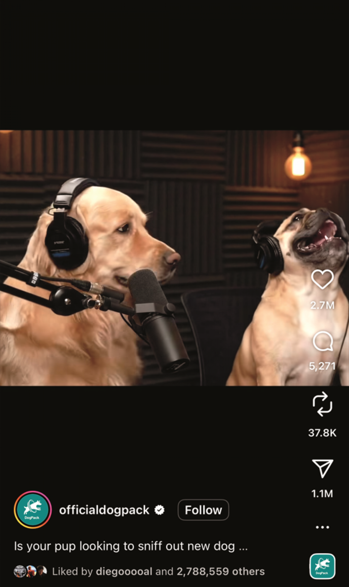Ustvarjalci te izboljšave pridno izkoriščajo. Jonathan Punski je najstarejši od štirih bratov, ki v Montrealu vodijo podjetje DogPack, namenjeno družabnemu mreženju lastnikov hišnih ljubljenčkov. Julija lani jih je navdihnil nepojmljivi trend posnetkov na podlagi umetne inteligence, ki na družbenih omrežjih prikazujejo govorečega jetija: zato so začeli objavljati posnetke psov, ki v studiu za podkaste zbijajo šale na račun svojih lastnikov in se smejejo. Gre ta tisto vrsto humorja, ki zabava vašega očeta, vi pa ob njem zavijate očmi. (Labradorec: "Vedno zastavljajo vprašanja s povsem jasnimi odgovori, na primer: Bi rad priboljšek? Kaj pa misliš, da sedim za zabavo?!") A bratje imajo zdaj na TikToku in Instagramu nekaj sto tisoč sledilcev in v svoj tako imenovani Pawdcast na željo lastnikov vključujejo tudi na spletu dobro poznane pse, kot je francoski buldog Walter Geoffrey. "Ljudje so se naveličali gledati lepe avtomobile, lepe ure in ljudi, ki se na družbenih omrežjih hvalijo, koliko denarja zaslužijo," pravi Punski in dodaja, da so videoposnetki cenovno dostopen način privabljanja novih strank v aplikacijo DogPack. "Želijo si malo zabave. In psi lahko zdaj govorijo."