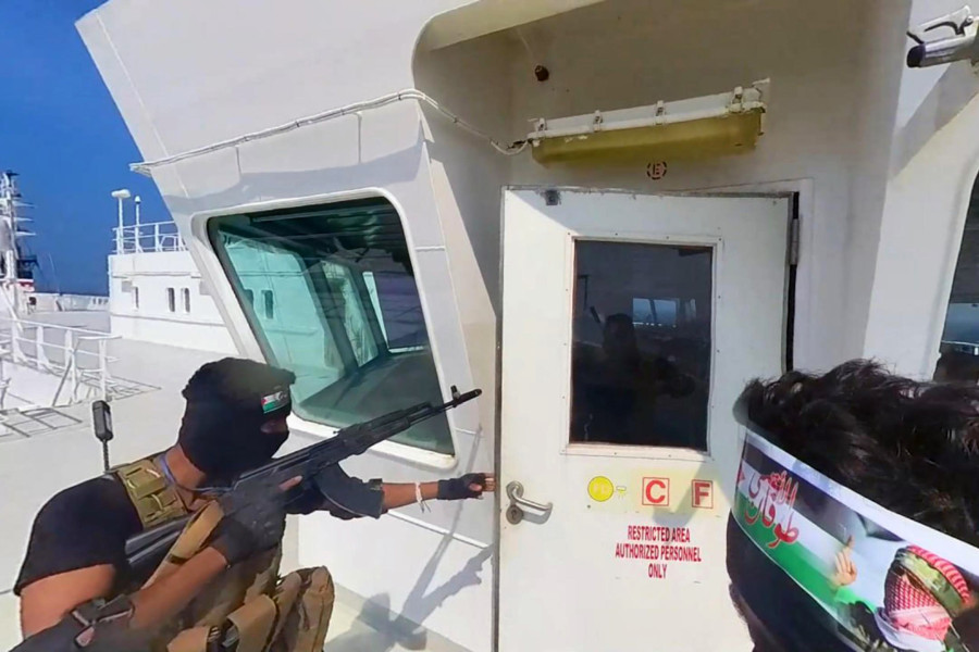 Posnetek zaslona iz videa ugrabitve tovorne ladje Galaxy Leader, ki so jo novembra 2023 hutijevski borci zajeli v Rdečem morju ob obali Jemna. Foto: Bloomberg