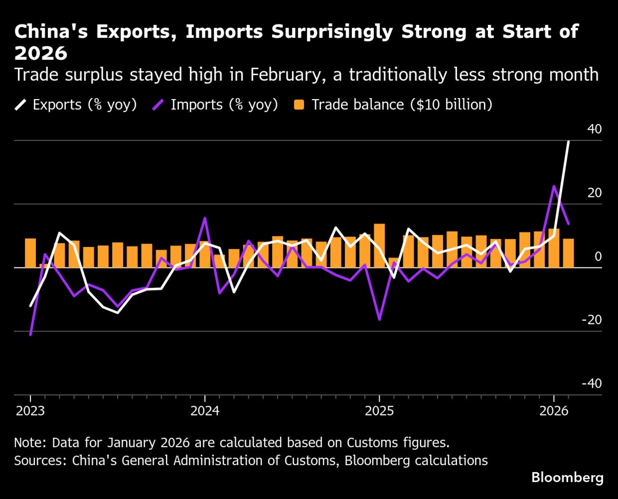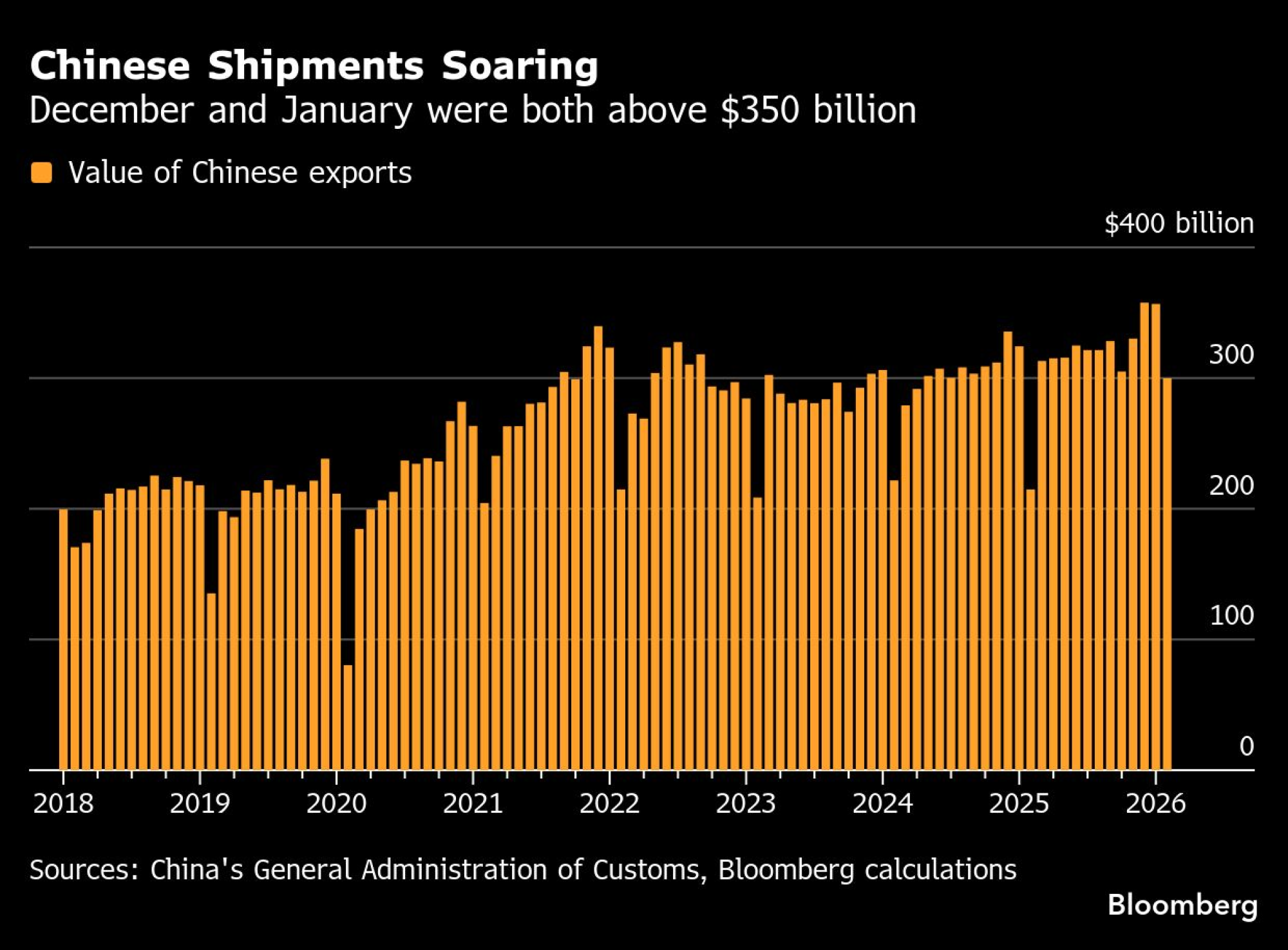 Skupna vrednost izvoza v januarju je znašala skoraj 357 milijard dolarjev – kar je drugi najvišji znesek za en mesec v zgodovini, kažejo izračuni Bloomberga, ki temeljijo na uradnih podatkih. Hkrati je bil upad v februarju veliko manjši kot običajno med počitnicami ob lunarnem novem letu.