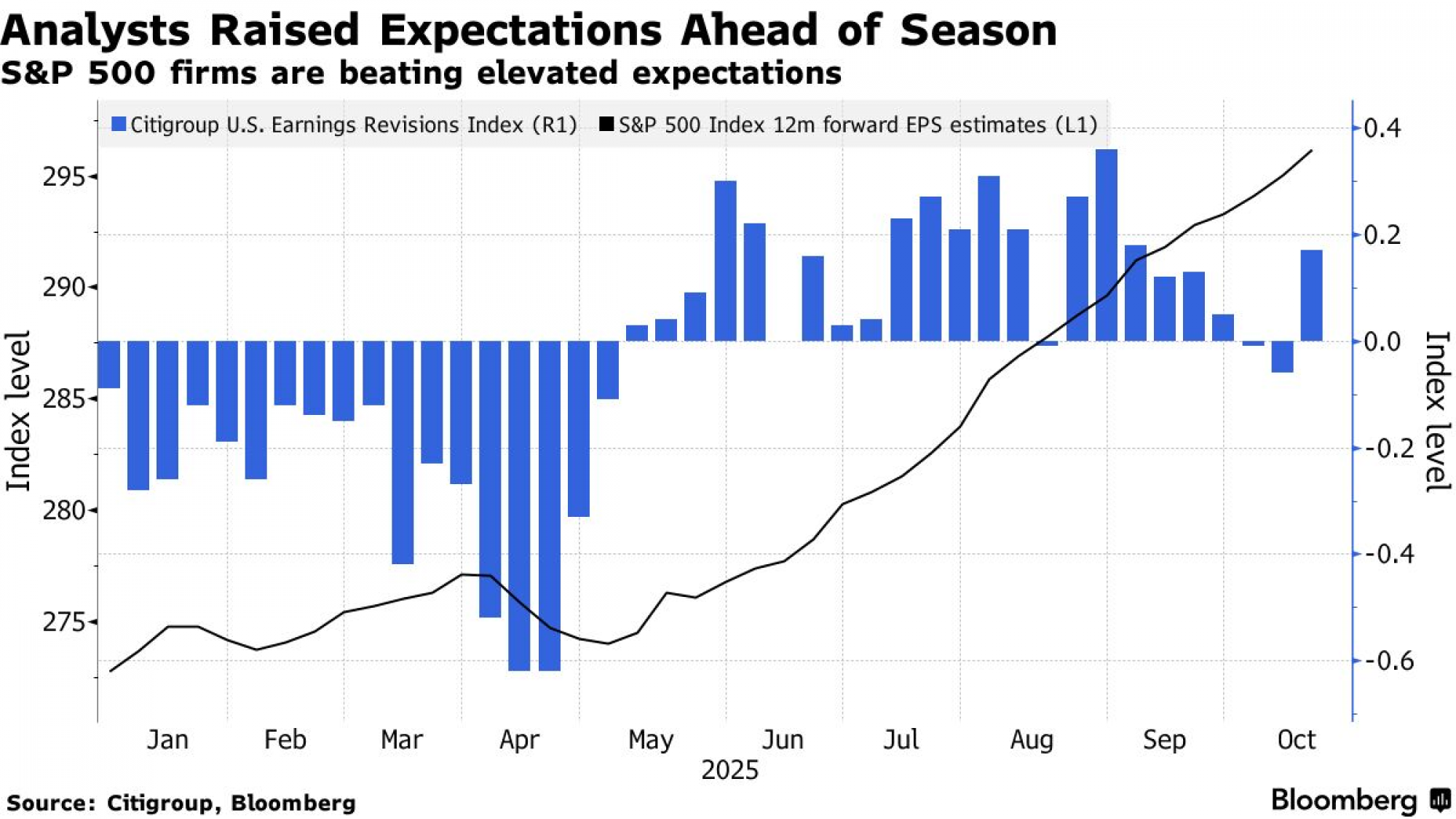 Večina podjetij iz indeksa S&P 500 običajno presega pričakovanja, vendar ta sezona izstopa, saj so analitiki z zvišanjem napovedi pred poročevalskim obdobjem postavili višje standarde. Krepki poslovni rezultati in znaki trajnostnih naložb v umetno inteligenco preprečujejo grožnje delnicam zaradi trgovinskih napetosti s Kitajsko in zaprtja vlade.