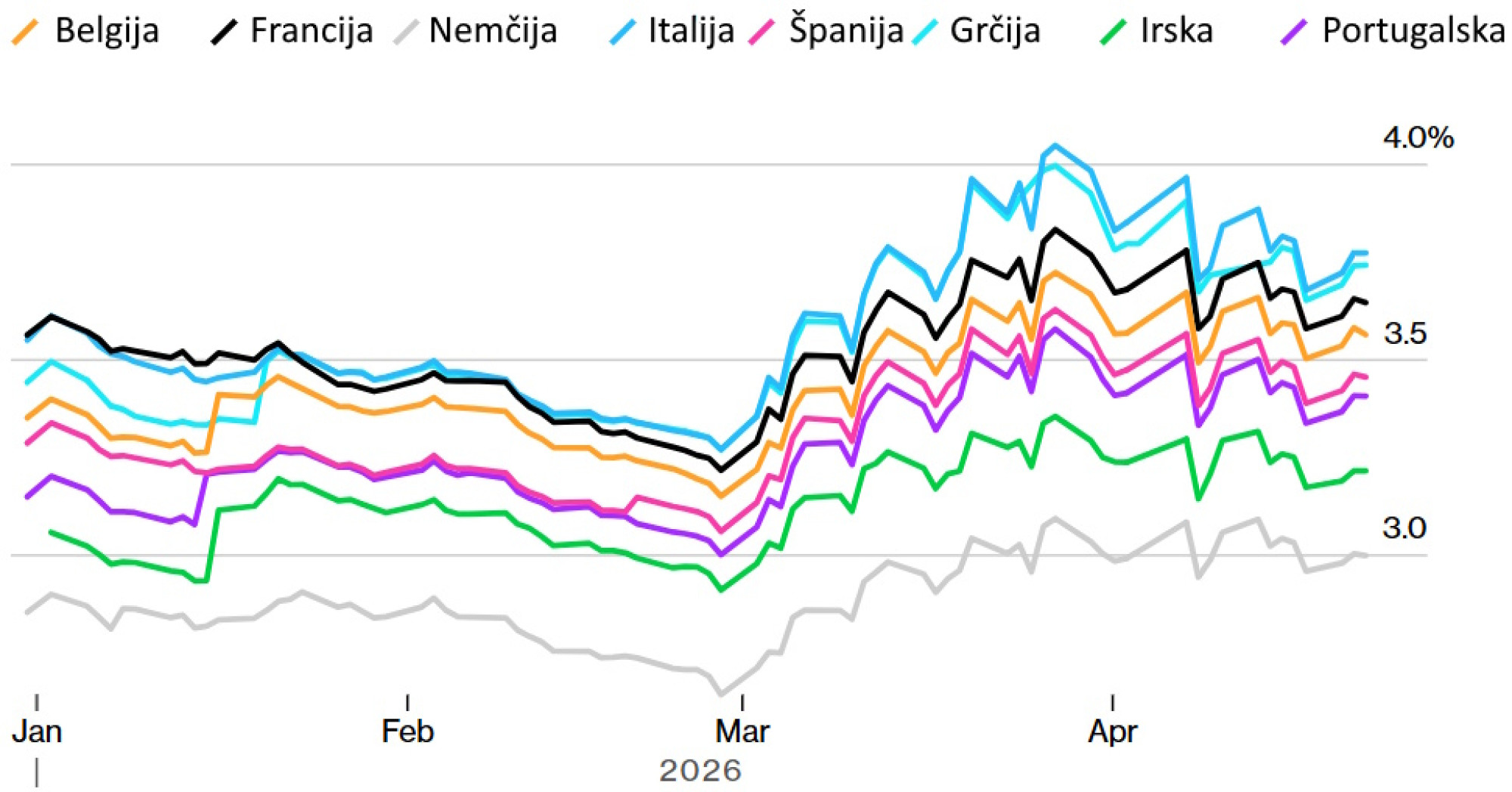 Zahtevani donosi na belgijske in francoske 10-letne obveznice presegajo tiste za španske in portugalske