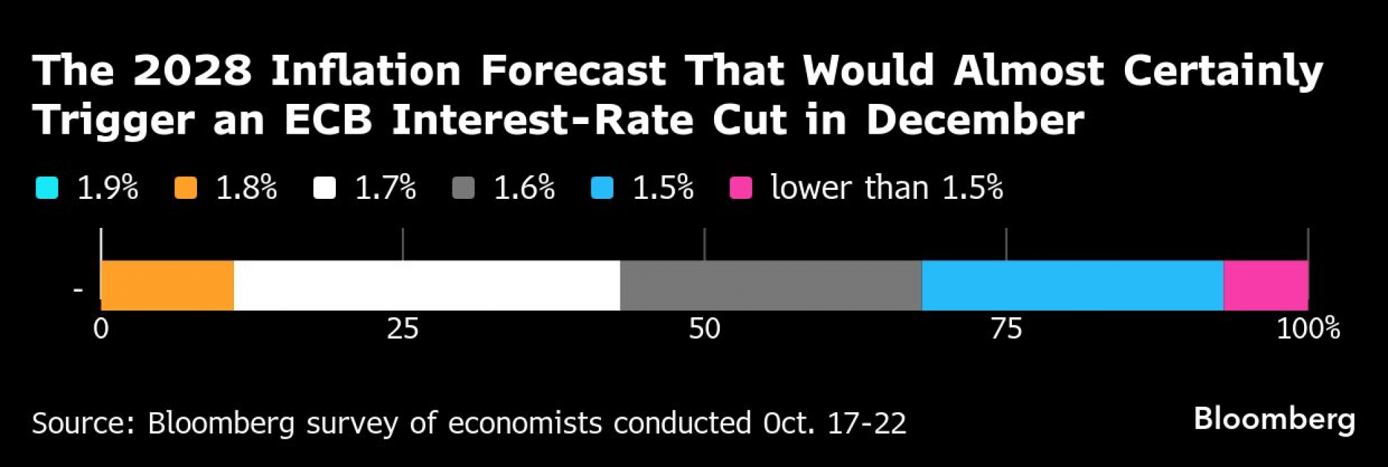 Napoved vključuje ohranitev obrestne mere za depozite nespremenjene na monetarnem srečanju prihodnji teden. Vendar pa nadaljnji ukrepi niso povsem izključeni: tretjina vprašanih napoveduje vsaj še eno znižanje poleg osmih dosedanjih, medtem ko 17 odstotkov vprašanih meni, da bo do konca prihodnjega leta prišlo do enega ali več zvišanj. Decembrska odločitev, ko bodo nove projekcije prvič vključevale tudi leto 2028, bodo ključne.
