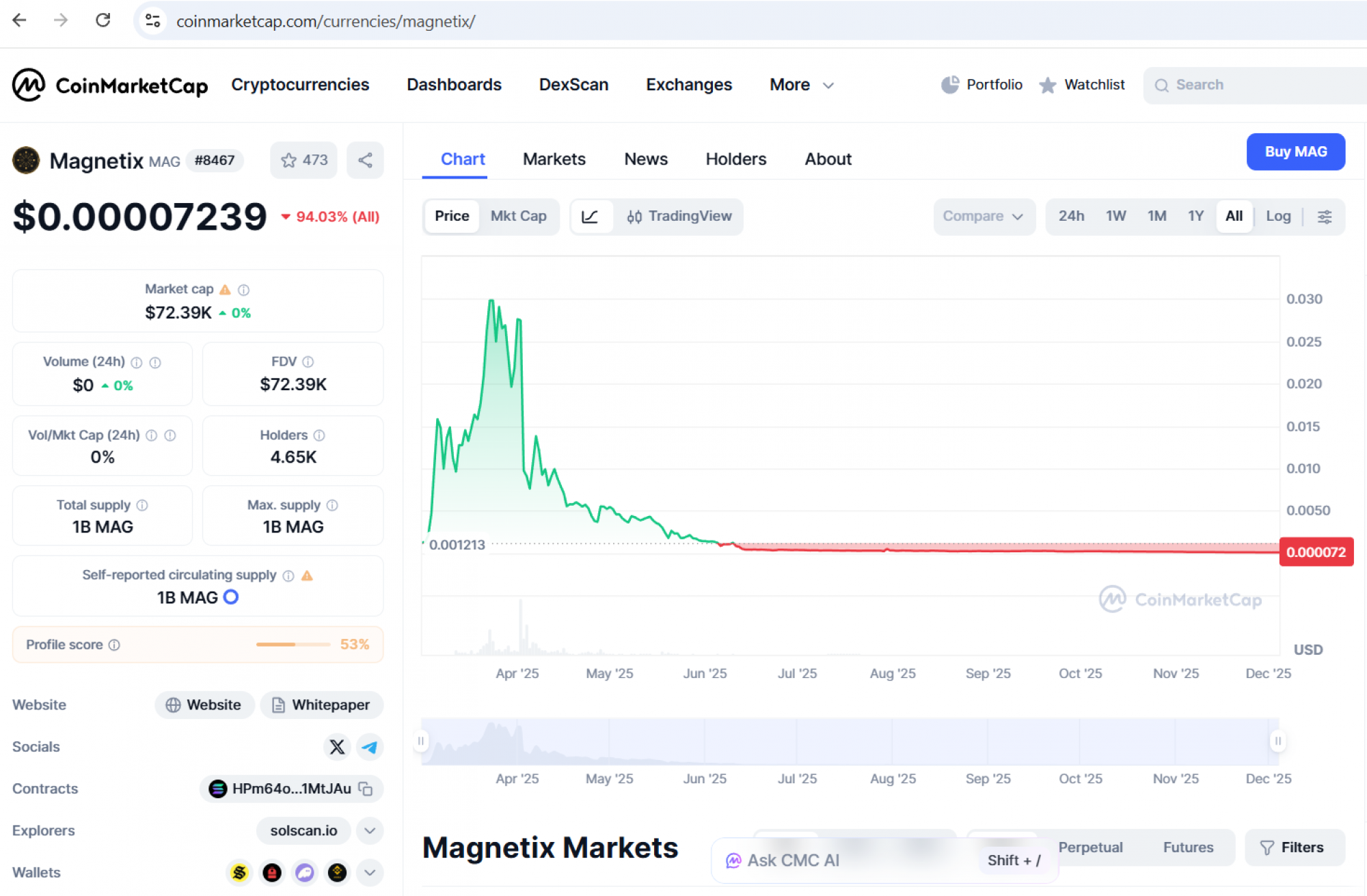 Kriptokovanec magnetix zdaj nima skoraj nobene vrednosti več. Njegova cena je 0,00007239 dolarja, kažejo podatki spletne strani Coinmarketcap. Cena je 99,8-odstotkov nižja od najvišje vrednosti, dosežene marca letos pri 0,03486 dolarja. Celotna tržna vrednost vseh kovancev s kratico MAG (skupaj je izdanih ena milijarda) zdaj znaša 72.390 dolarjev.