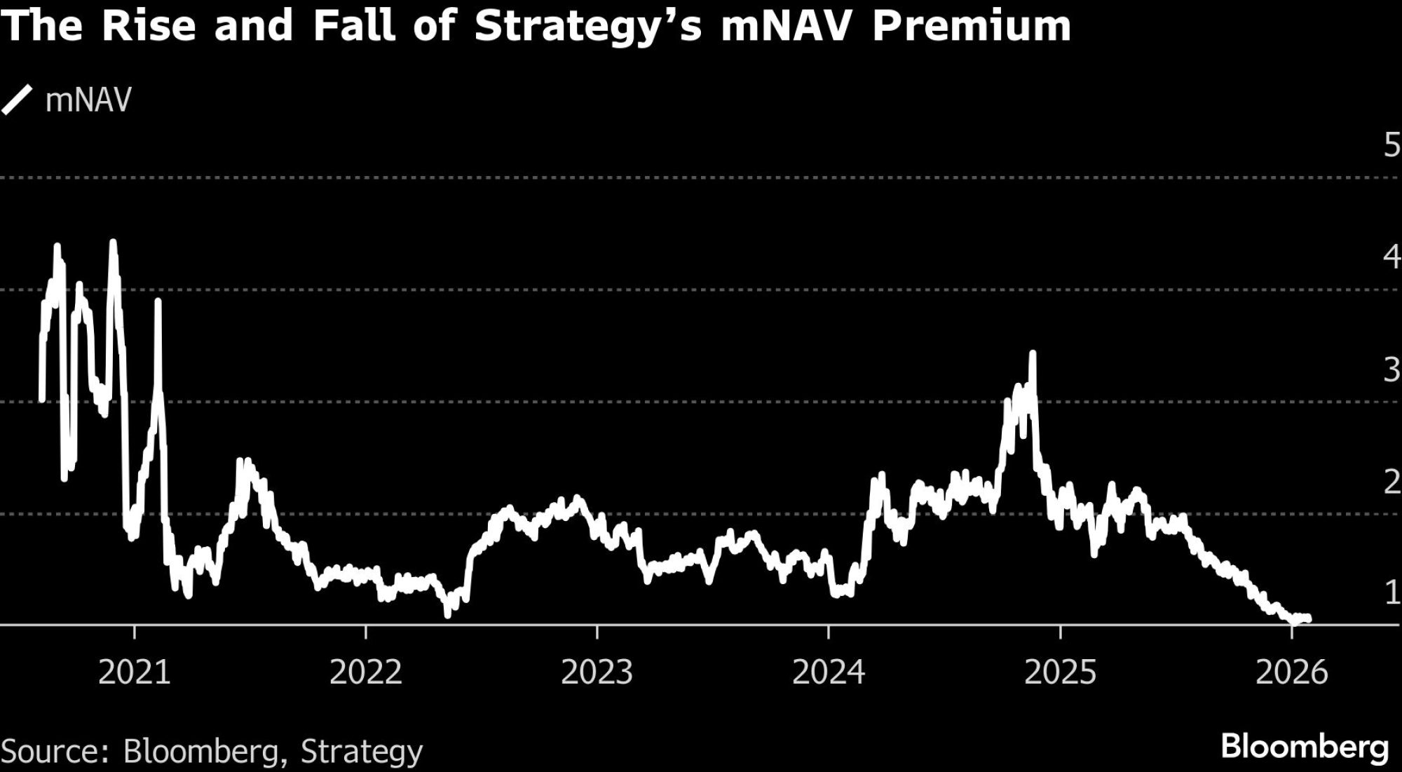 Bistvo družbe je preprost mehanizem: zbiranje denarja s prodajo delnic, ki trgujejo nad vrednostjo njenih bitcoinov, nato pa uporaba tega denarja za nakup več žetonov. Ta trik kapitalskih trgov – dejansko kopičenje kriptovalut prek arbitraže na borzi – je podjetje v zadnjem bikovskem teku naredil za priljubljeno med špekulativnimi vlagatelji. Toda ta faza je minila.