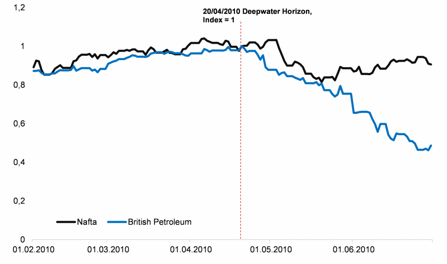 Eden najbolj slikovitih primerov, kako cena delnice naftne družbe ni nujno povezana s ceno nafte, je katastrofa Deepwater Horizon v Mehiškem zalivu leta 2010. Ko je 20. aprila 2010 na platformi BP Deepwater Horizon prišlo do eksplozije, se je cena nafte ločila od cene delnice BP-ja. Ste še vedno prepričani, da so naftne družbe prava izbira?