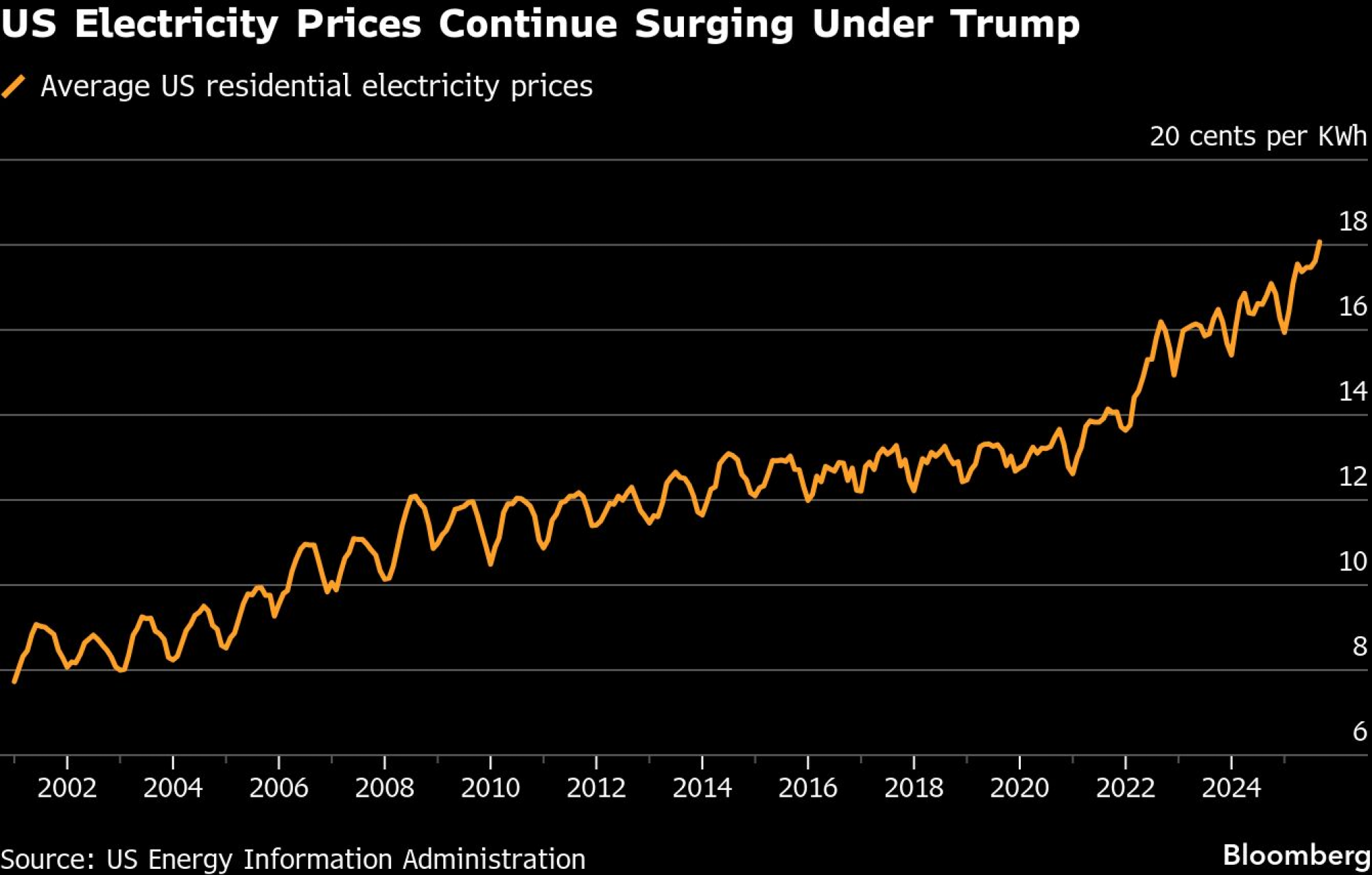 Trump je obljubil, da bo cene električne energije v letu po nastopu mandata prepolovil. Namesto tega so se zaradi močnega naraščanja povpraševanja zvišale. Na nacionalni ravni je povprečna maloprodajna cena električne energije v septembru narasla za 7,4 odstotka, na rekordnih 18,07 centa na kilovatno uro, kar predstavlja največje zvišanje od decembra 2023, po najnovejših uradnih podatkih. Cene za gospodinjstva so se zvišale še bolj, za 10,5 odstotka med januarjem in avgustom 2025, kar je eno največjih povečanj v več kot desetletju, kažejo podatki Nacionalnega združenja direktorjev programov energetske pomoči.