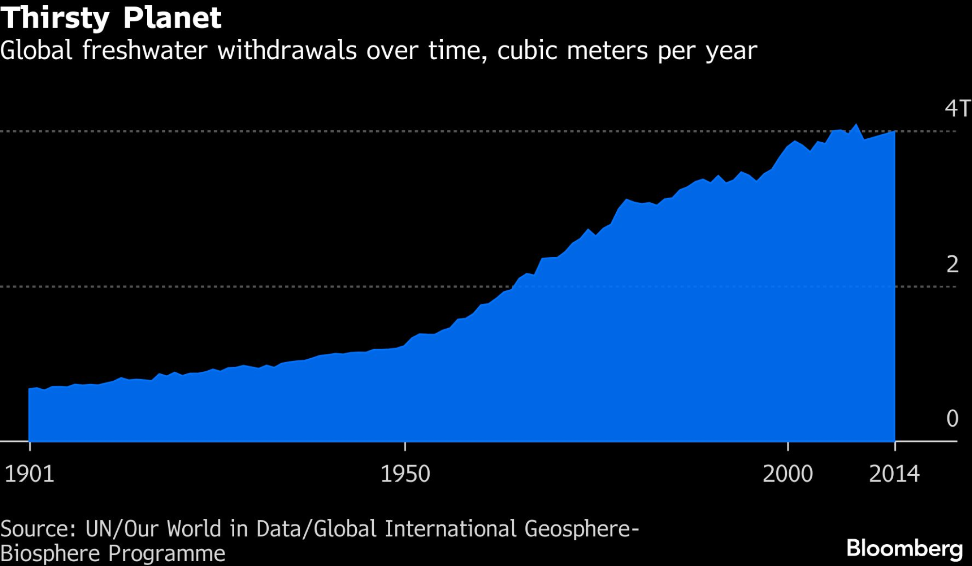 Globalno črpanje sladke vode skozi čas, v kubičnih metrih na leto. Vir: Bloomberg