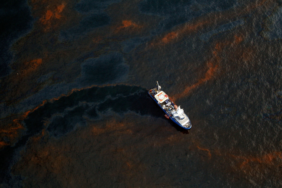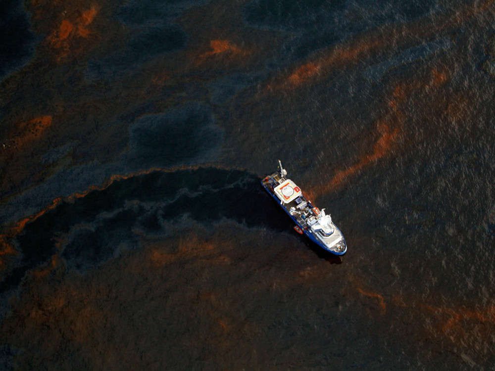 Ladja pluje skozi naftni madež, ki je iztekel iz vrtine Deepwater Horizon v Mehiškem zalivu leta 2010. Foto: Chris Graythen/Getty Images