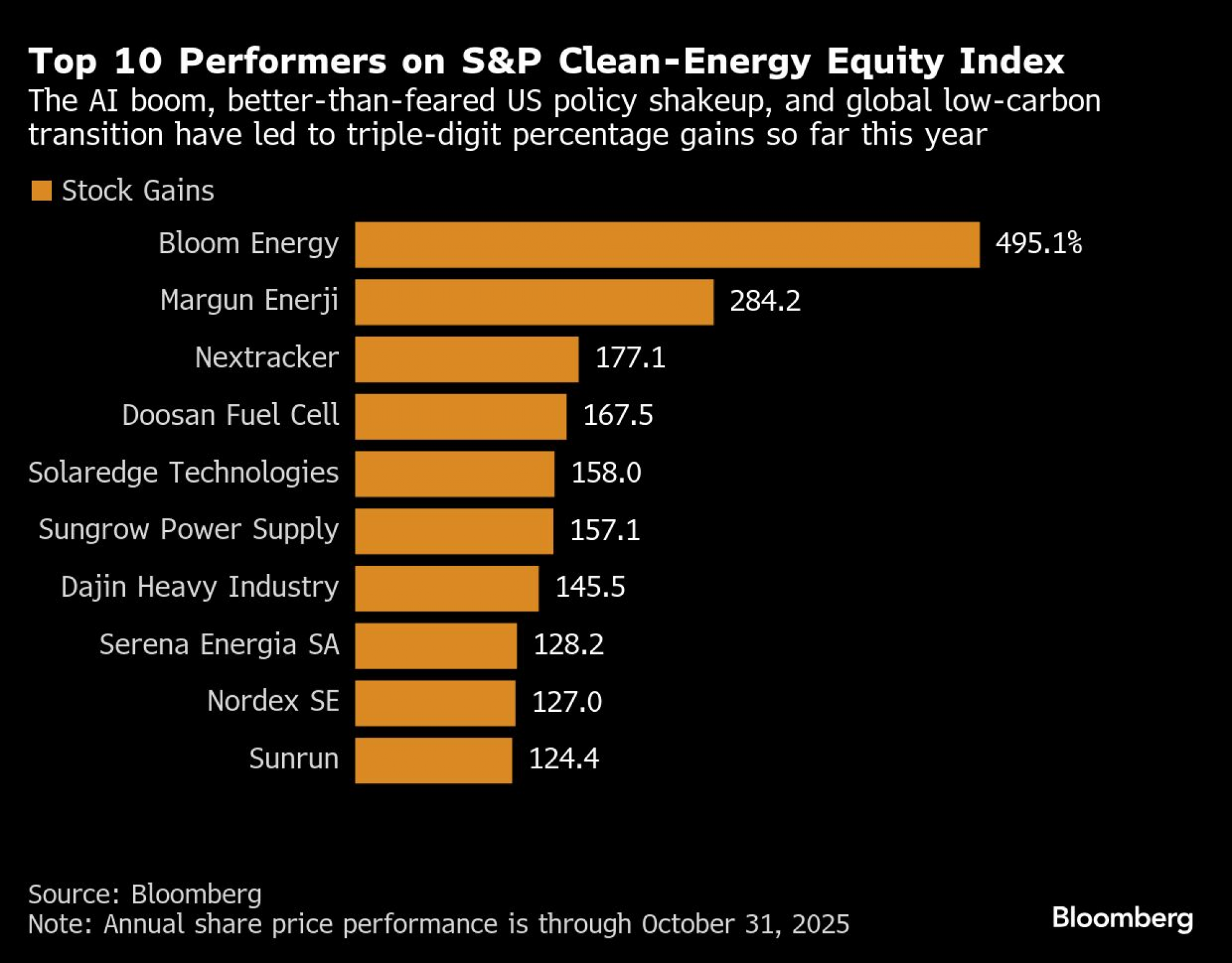 Najboljši rezultat v letošnjem S&P Global Clean Energy Transition indeksu beleži Bloom Energy Corp., proizvajalec sistemov gorivnih celic na trdni oksid, ki omogočajo proizvodnjo električne energije neposredno na mestu porabe. Njihova delnica je od začetka leta poskočila skoraj za 500 odstotkov.