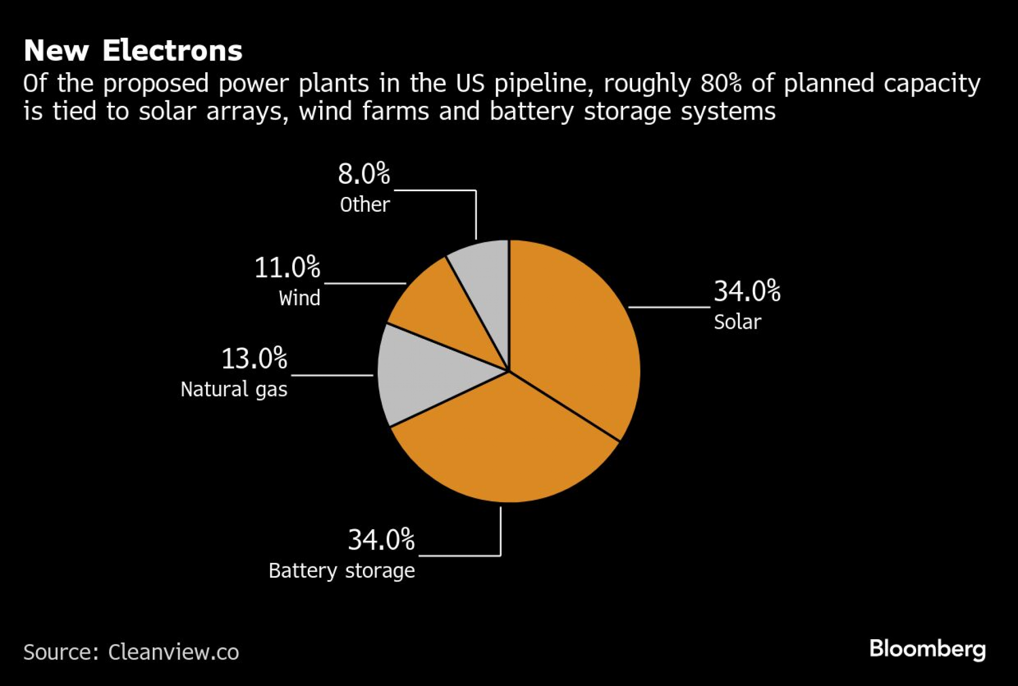 Okoli 80 odstotkov načrtovanih kapacitet v ZDA predstavljajo solarni, vetrni in baterijski sistemi. Foto: Bloomberg