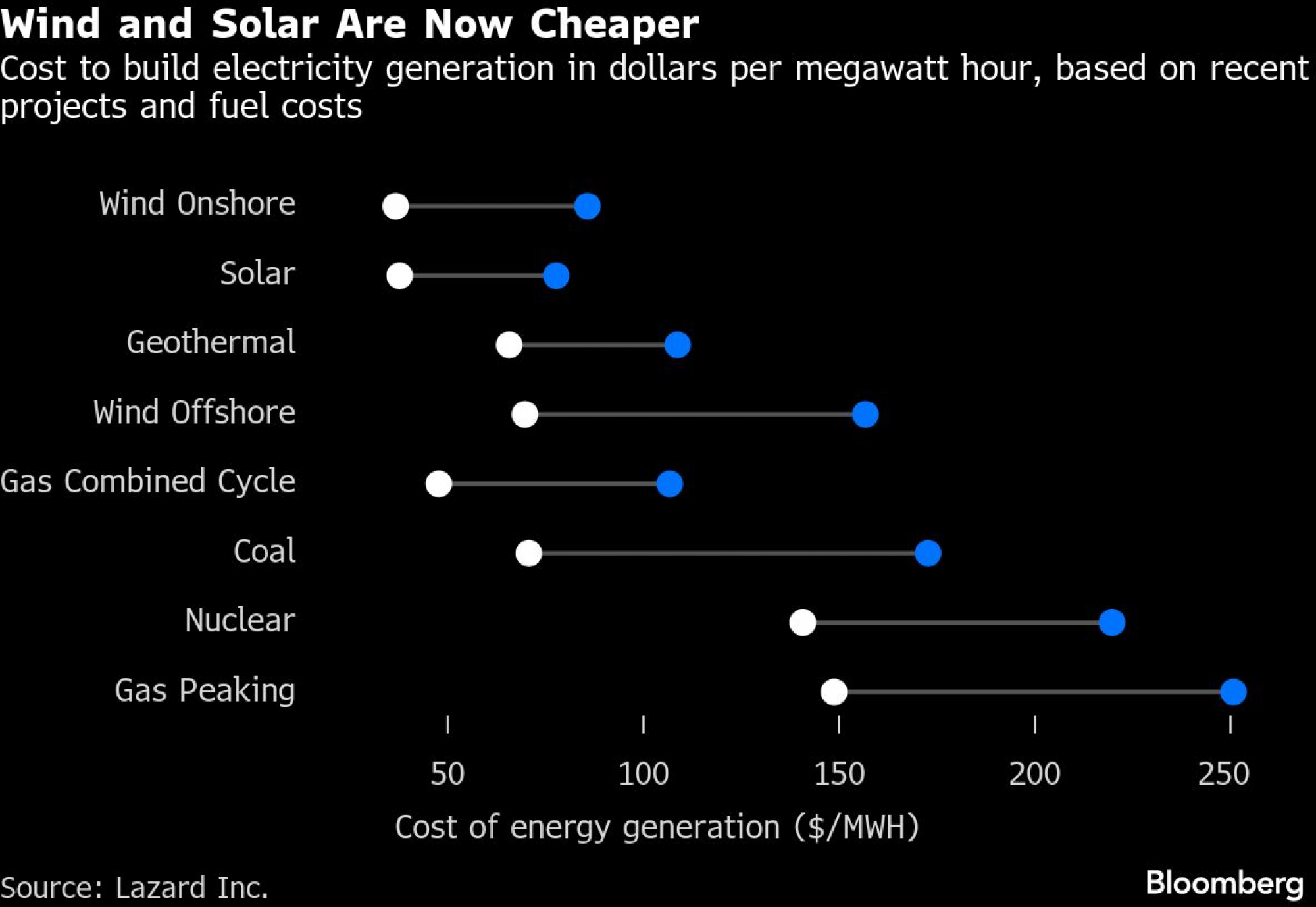 Strošek izgradnje proizvodnje električne energije v dolarjih za megavatno uro (temelji na nedavnih projektih in cenah goriva). Foto: Bloomberg