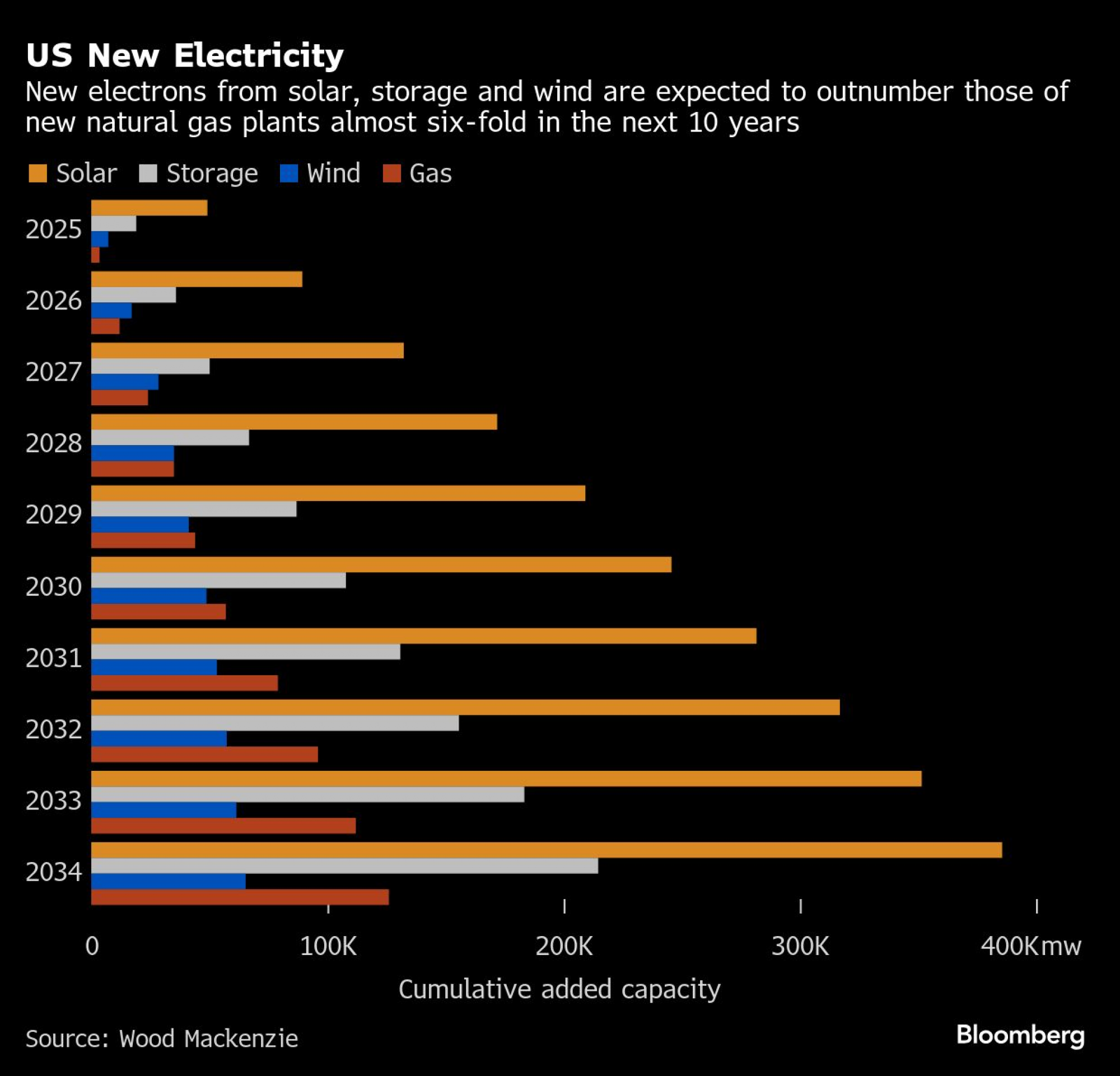 Na koncu lahko razkorak med hitrostjo gradnje podatkovnih centrov in počasnejšo rastjo energetskih kapacitet še dodatno pospeši razvoj obnovljivih virov. Wood Mackenzie ocenjuje, da je ukinitev zelenih spodbud zmanjšala njihovo načrtovano rast le za osem odstotkov. Do leta 2034 bi ameriška komunalna podjetja lahko dodala še 666 gigavatov sončne energije, baterijskih sistemov in vetrne energije, v primerjavi z zgolj 126 gigavati novih plinskih elektrarn.