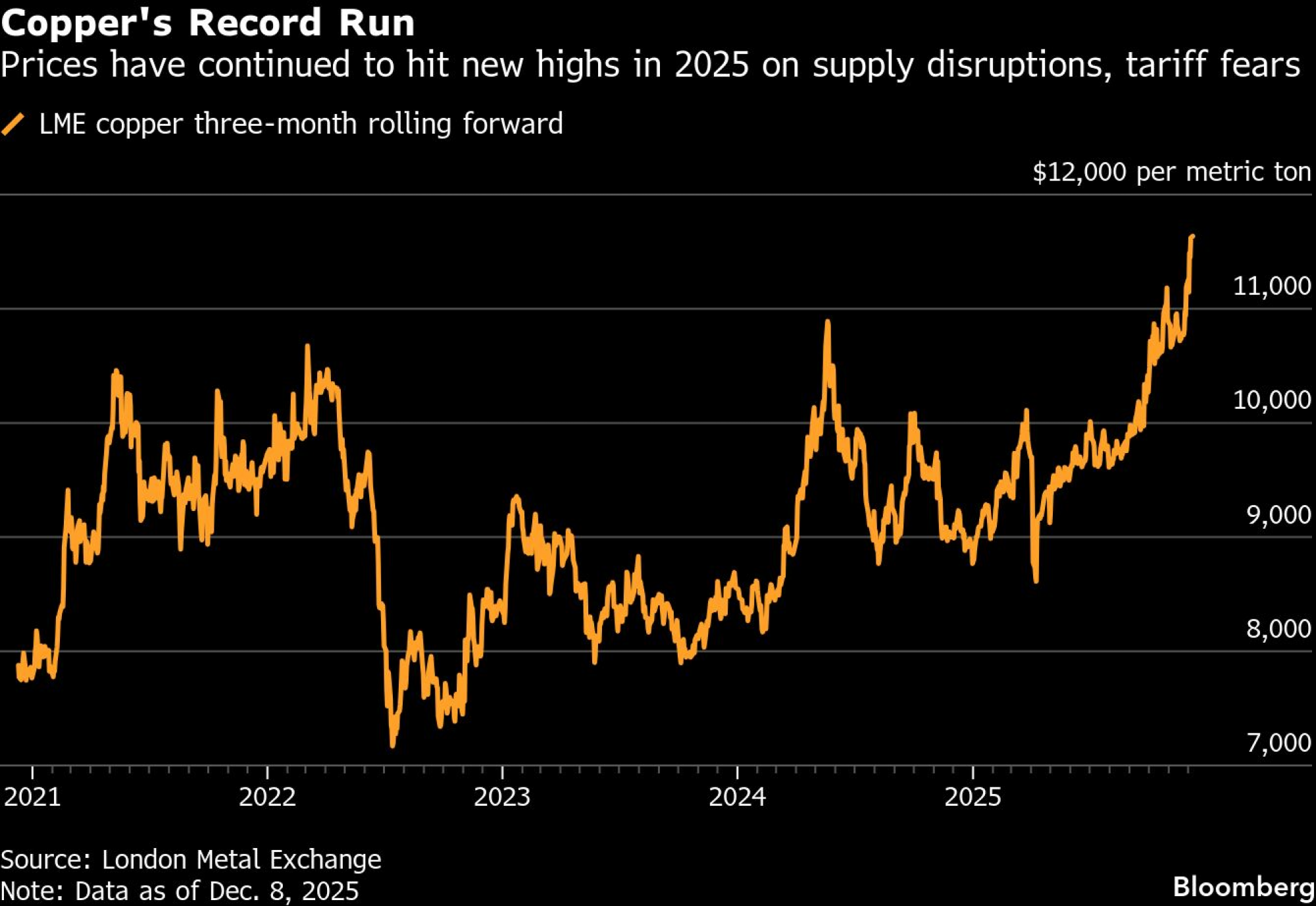 Trg je letos prizadel val zastojev v rudnikih, od Čila do Indonezije. Hkrati so prisotni strahovi, da bi ameriški predsednik Donald Trump lahko uvedel carine na rafinirane bakrene izdelke, spodbudili kopičenje zalog v ZDA, kar je izpraznilo skladišča drugje po svetu. Ko narašča zaskrbljenost glede oskrbe, je cena bakra na Londonski borzi kovin decembra prebila rekordnih 11.700 dolarjev na tono.