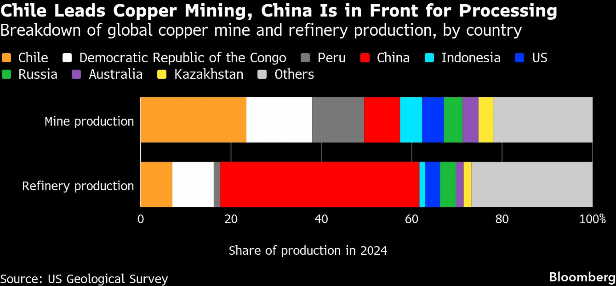 Kitajska je po velikosti zalog šele osma po podatkih ameriškega geološkega zavoda, a to nadomešča z nakupom rudnikov v tujini in ogromnimi domačimi kapacitetami taljenja. Leta 2024 je bila odgovorna za več kot 40 odstotkov svetovne proizvodnje rafiniranega bakra.