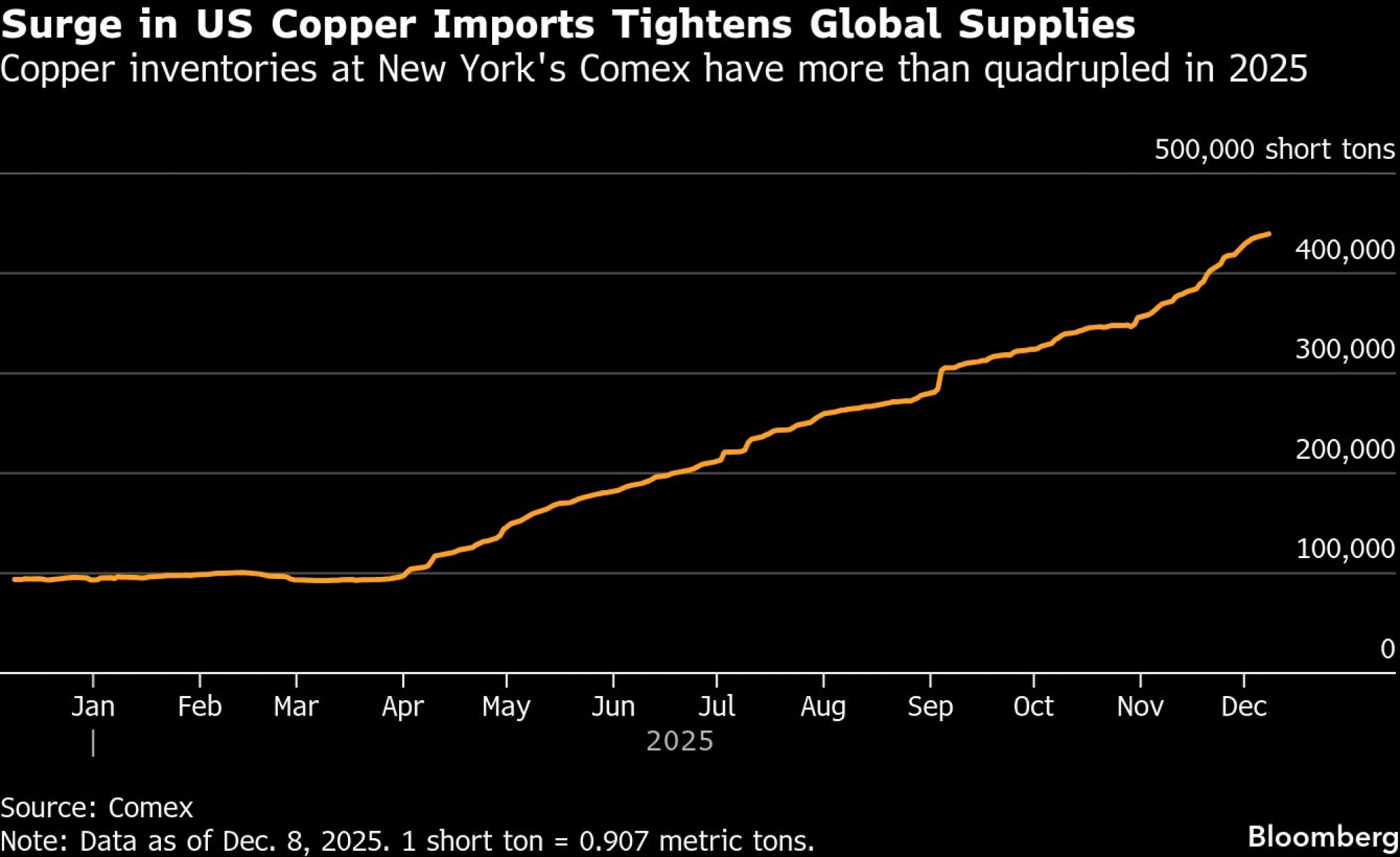 Zaloge bakra na newyorškem Comexu so se v letu 2025 več kot početverile. Vir: Bloomberg
