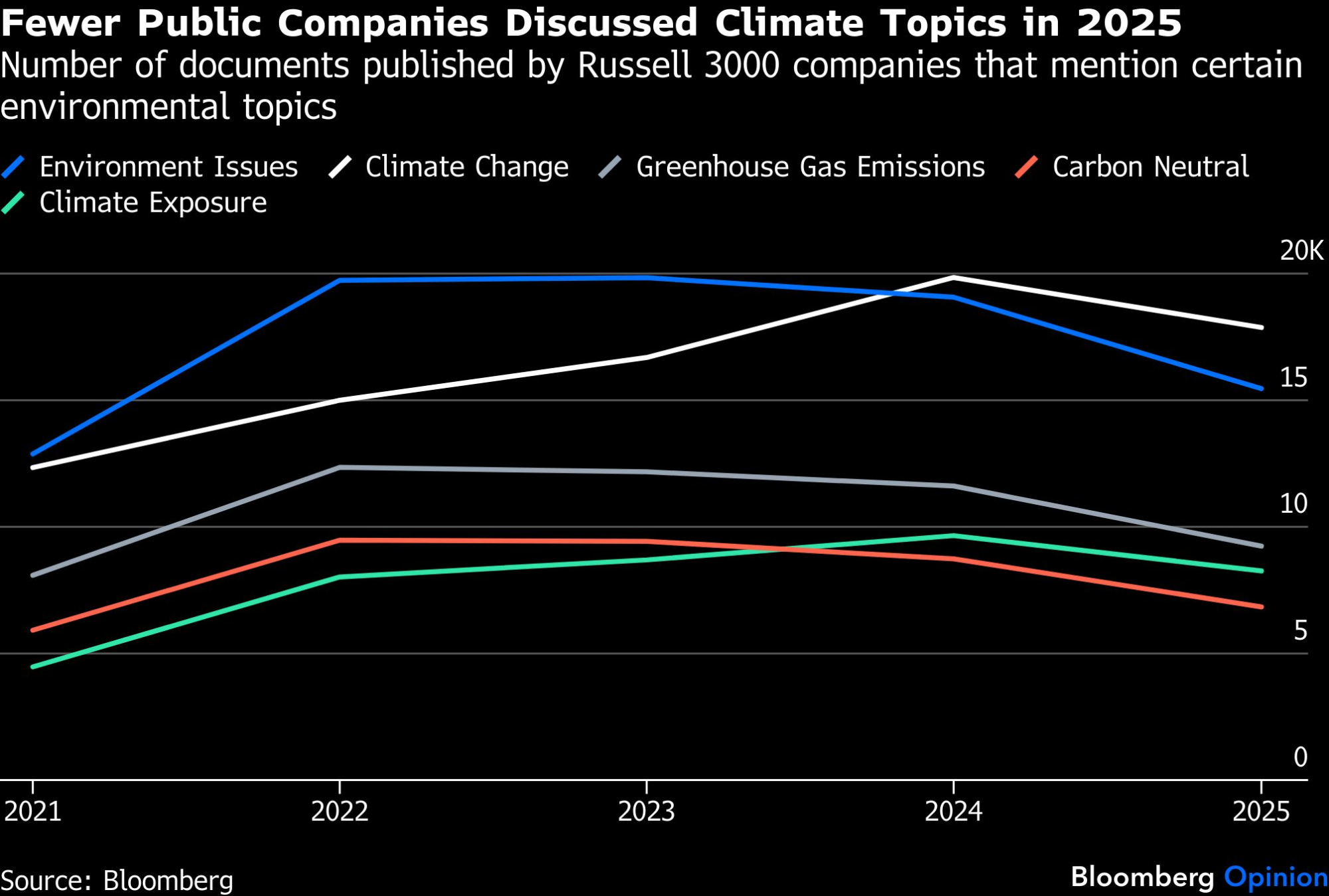 Število dokumentov, ki so jih objavile družbe iz indeksa Russell 3000, v katerih se omenjajo določene okoljske teme. Vir: Bloomberg