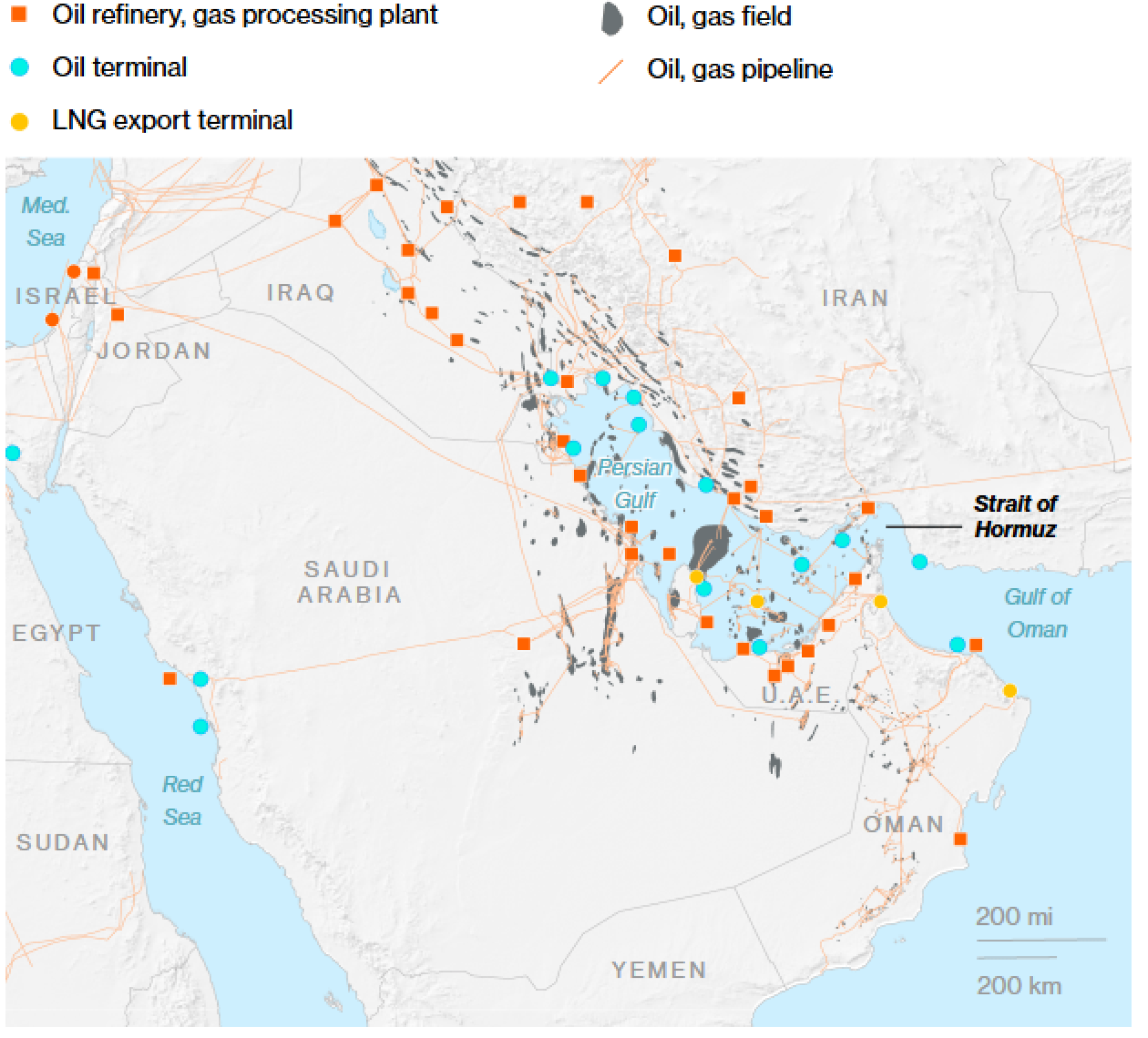 Savdska Arabija, Irak, ZAE in Kuvajt so morali zaradi dejanskega zaprtja Hormuške ožine zmanjšati proizvodnjo surove nafte, medtem ko je Katar ustavil obratovanje utekočinjenega zemeljskega plina. Ta država je eden od treh največjih svetovnih dobaviteljev tega goriva.