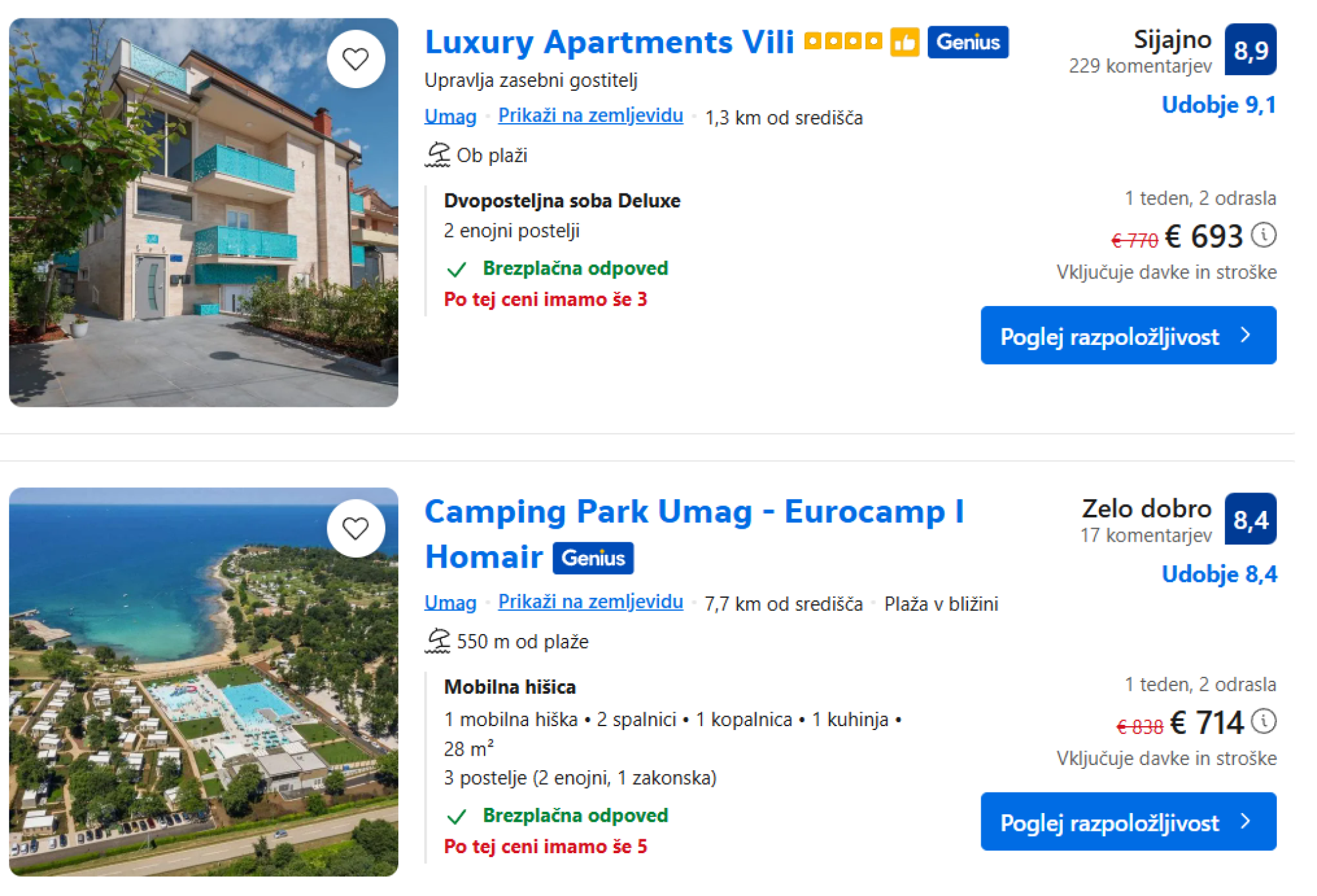 Zanimale so nas tudi cene letovanja na hrvaški obali v prihajajočem poletju. Pregledali smo prve, torej first minute ponudbe na portalu Booking za zadnji teden junija (za dve osebi). Cene, ki že v izhodišču niso pretirano visoke – v Umagu se denimo gibljejo približno med 600 in 1.300 evri za teden dni – so pri večini nastanitev dodatno znižane za 10 do 20 odstotkov. Zelo podobno sliko kaže tudi ponudba v Poreču, kjer smo trizvezdične apartmaje, oddaljene približno pol kilometra od plaže, našli že za približno 480 do 1.100 evrov na teden.