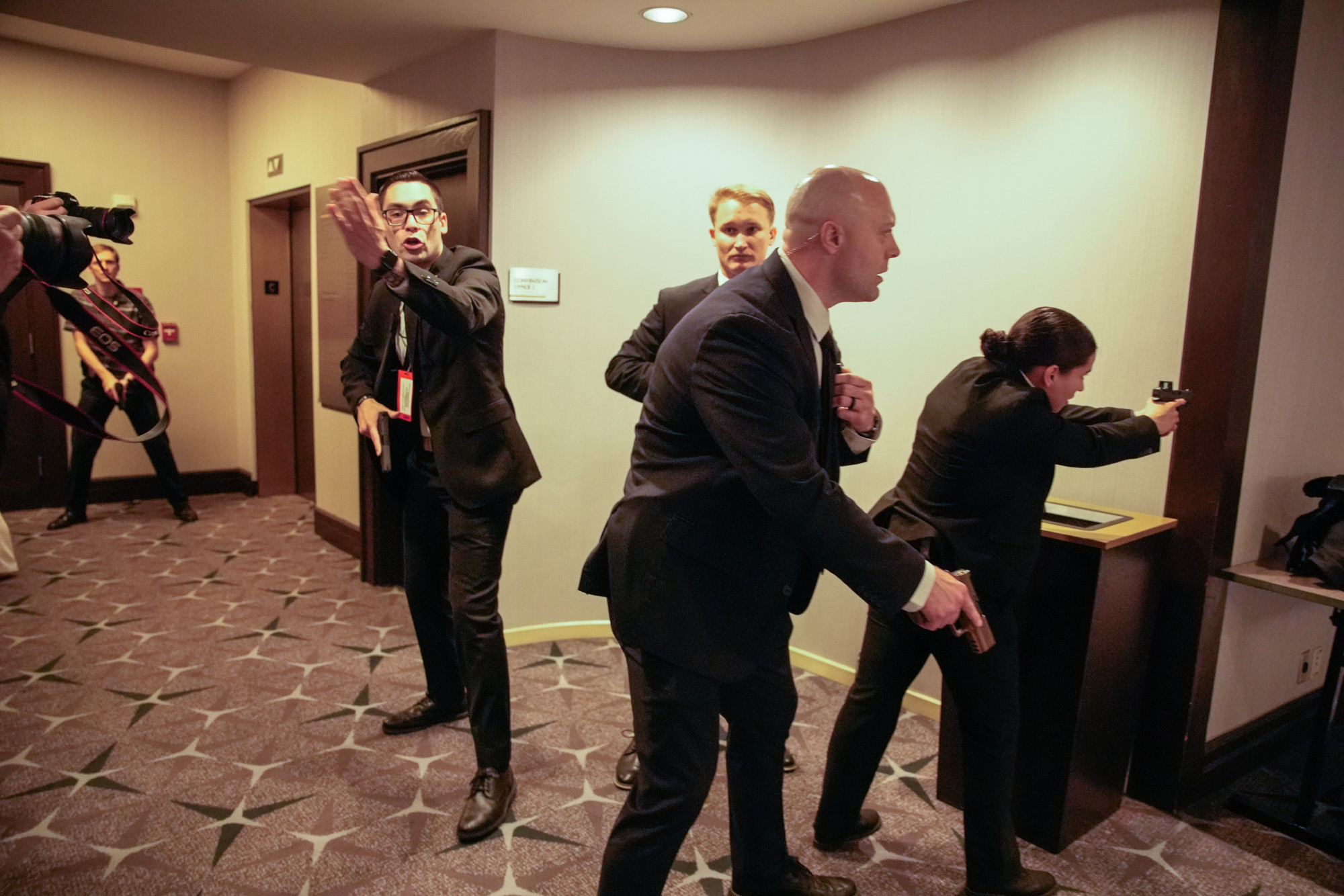 John Lambert, udeleženec večerje in predsednik podjetja Boat Evolution Inc., je dejal, da je videl moškega, ki je tekel mimo varovanja proti stopnicam do dvorane. Več varnostnikov je šlo za njim, slišati je bilo veliko strelov, morda celo do 20 - toliko naj bi jih izstrelili proti osebi, ki je tekla proti stopnicam. Lambert je povedal, da so ga nemudoma usmerili na moško stranišče.