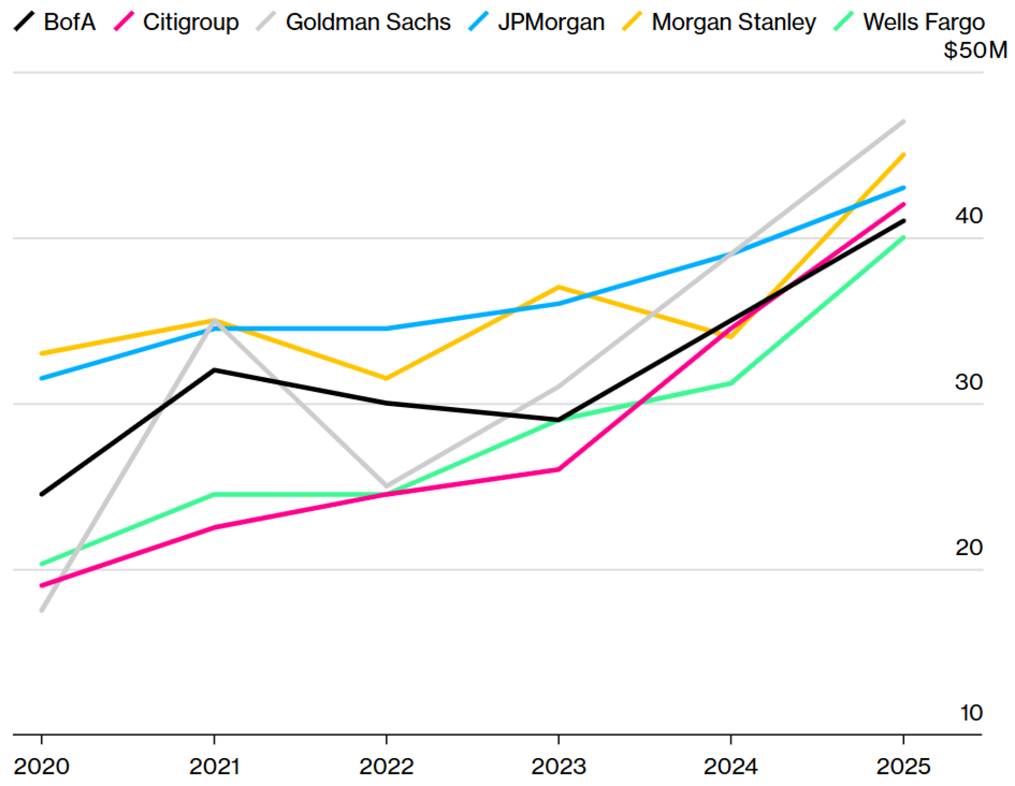 Kot da smo spet leta 2006: močna rast plač direktorjev največjih bank z Wall Streeta