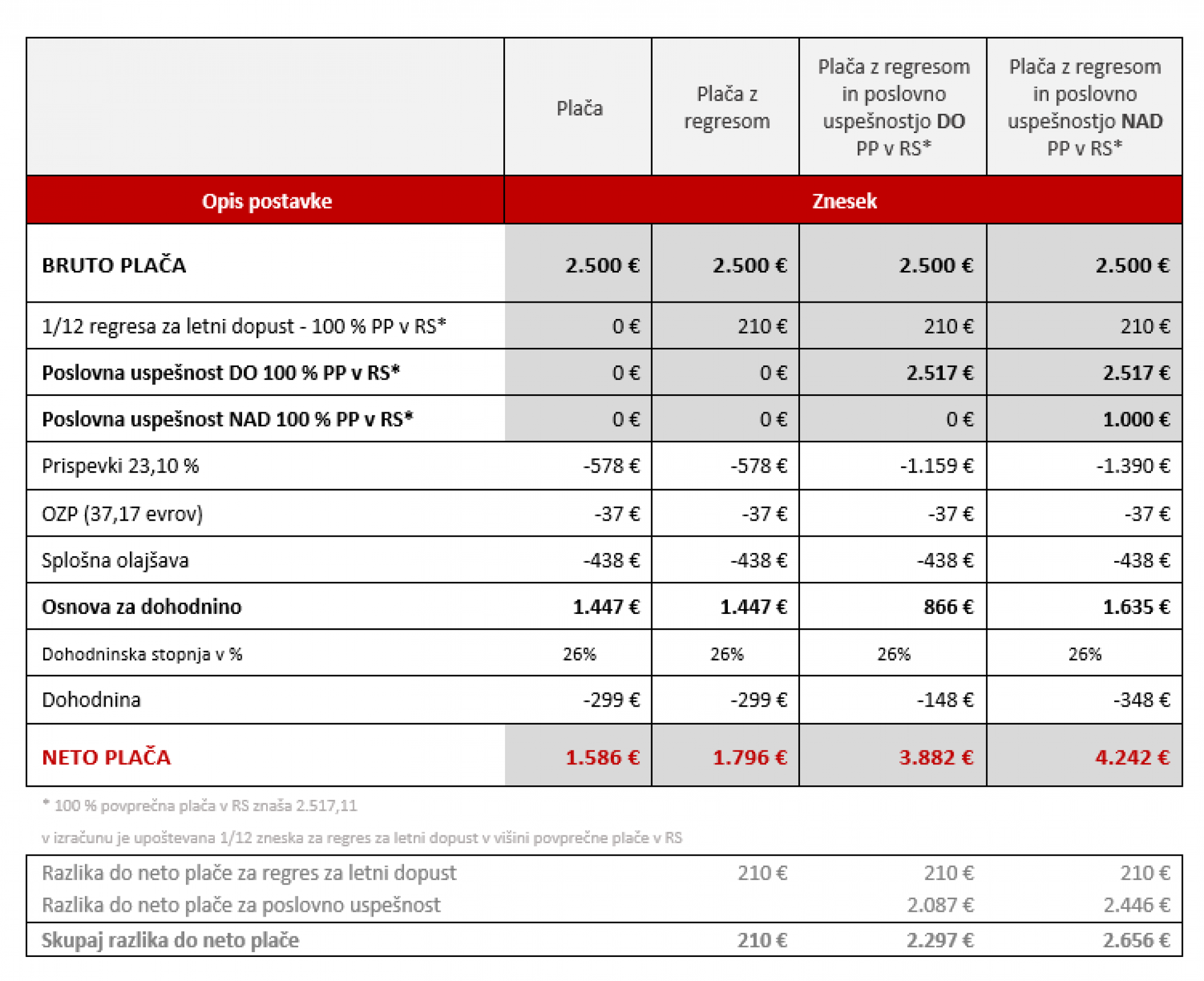 Izplačilo poslovne uspešnosti v denarju ali naravi (v plemenitih kovinah) lahko tudi presega povprečno plačo v Sloveniji, a je znesek, ki je presega povprečno plačo, podvržen obračunu davkov in prispevkov, kot to velja za izplačilo plače.