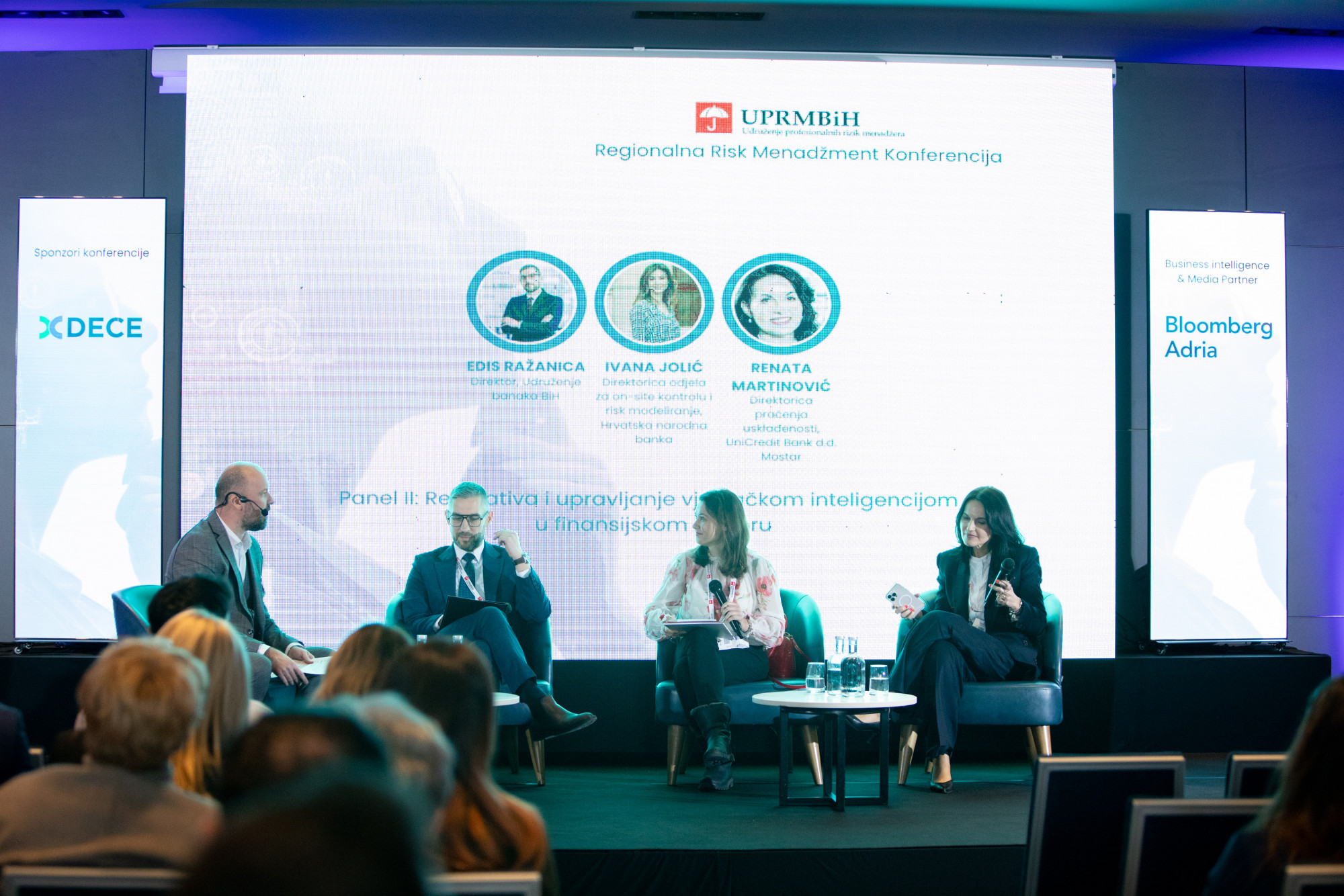Zadnji del te tretje regionalne konference o upravljanju tveganj je predstavljal panel o regulaciji in upravljanju umetne inteligence v finančnem sektorju, o katerem so razpravljali direktor Združenja bank Bosne in Hercegovine Edis Ražanica, direktorica oddelka za nadzor na lokaciji in modeliranje tveganj Hrvaške narodne banke Ivana Jolić ter direktorica spremljanja skladnosti pri UniCredit Bank d.d. Mostar Renata Martinović.