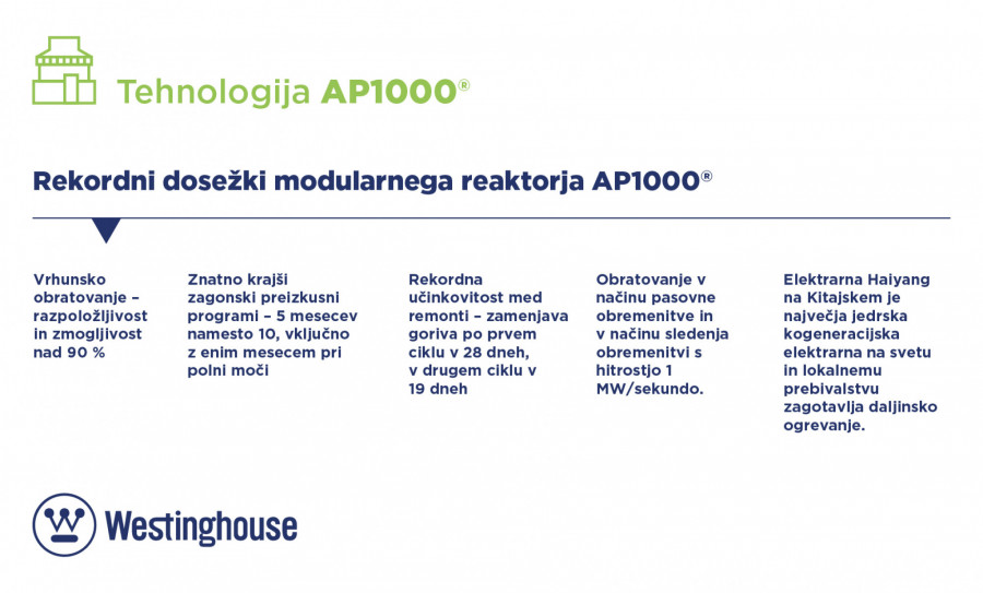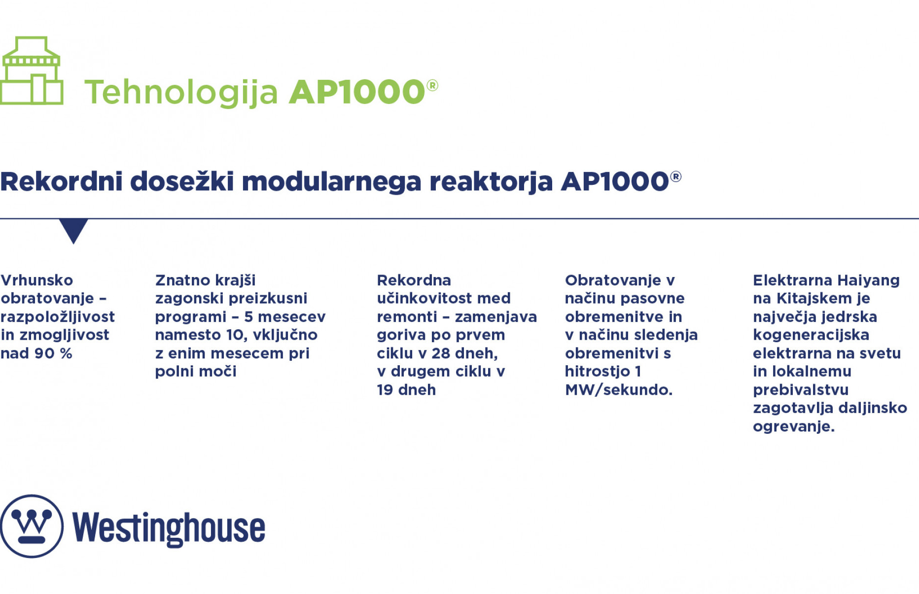 Kje se tokrat opisani reaktor AP1000 že dokazuje v praksi? V Sanmenu in Haiyangu na Kitajskem obratujejo štiri enote AP1000, ki dosegajo rekorde v obratovalni učinkovitosti, vključno z odzivanjem na nihanja v omrežju s hitrostjo 1 MW/s. Prav tako je že v teku gradnja osmih novih enot na Kitajskem, še dodatne štiri pa so odobrene. Poleg tega v ZDA na lokaciji Vogtle obratujeta dve enoti AP1000 s prav tako odličnimi rezultati. Se bo temu seznamu rekorderjev po energetski učinkovitosti pridružila tudi Slovenija? Za Slovenijo je AP1000 eden izmed glavnih kandidatov za projekt JEK2 (drugi blok Nuklearne elektrarne Krško). Njegove prednosti v tem kontekstu so združljivost z obstoječim znanjem (Westinghousova tehnologija je že v obstoječem bloku), robustna varnostna zasnova, primerna za specifične lokacijske pogoje, in dejstvo, da gre za zahodno tehnologijo, kar olajša geopolitična in dobavna vprašanja.