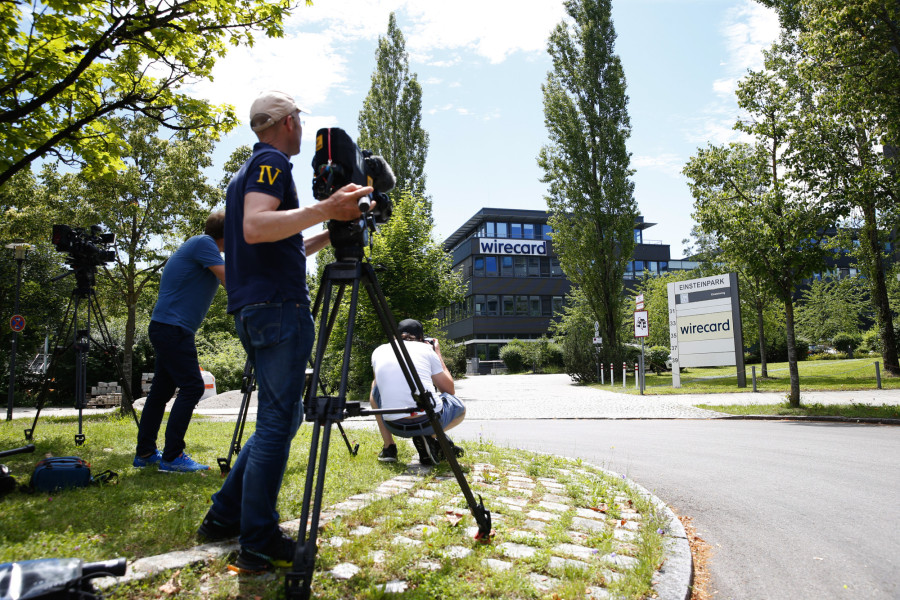 Televizijske ekipe pred sedežem družbe Wirecard med policijsko in tožilsko racijo v Münchnu leta 2020. Foto: Michaela Handrek-Rehle/Bloomberg