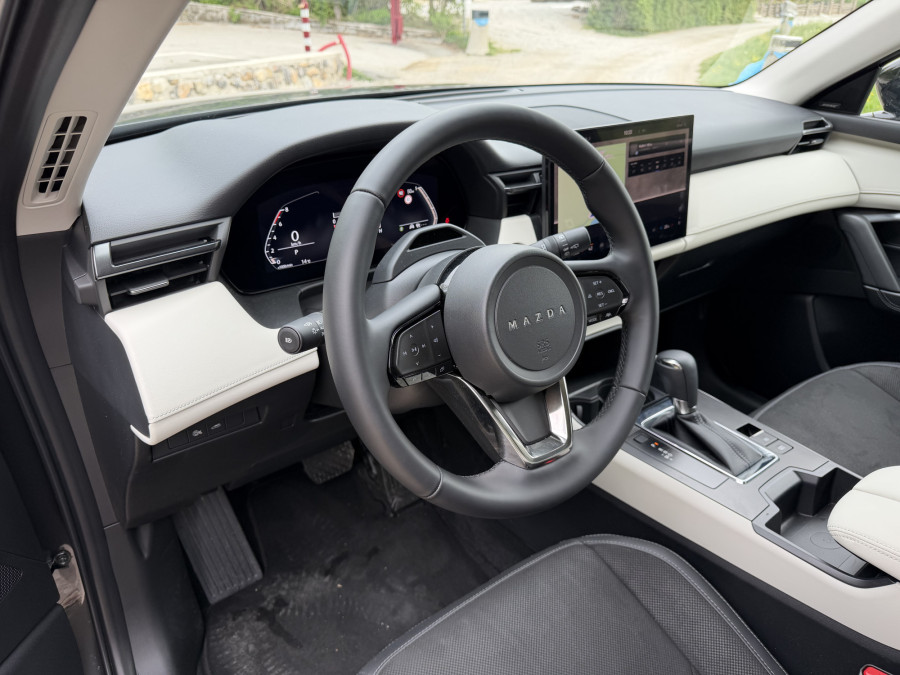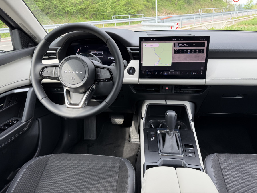 Prečiščenost je evfemizem za digitalizacijo, ki je v novinki naredila gromozanski korak naprej. V kabini skorajda ni fizičnih stikal in gumbov, je pa nov informativno-razvedrilni sistem, občutljiv za dotik in premera 12,9 oziroma 15,6 palca v bolje opremljenih različicah. Na smetišče zgodovine se odpravlja tudi Mazdin ikonični vrtljivi gumb za njegovo upravljanje na sredinskem grebenu med voznikom in sovoznikom. Prvič so pri Mazdi integrirane Googlove storitve, kar prinaša intuitivno navigacijo in povezljivost, pri čemer je povezava z internetom prva tri leta brezplačna. Tehnološki nabor dopolnjujejo digitalni merilniki, projicirni HUD-zaslon in volanski obroč, ki je skupaj s stikali občutljiv za dotik.