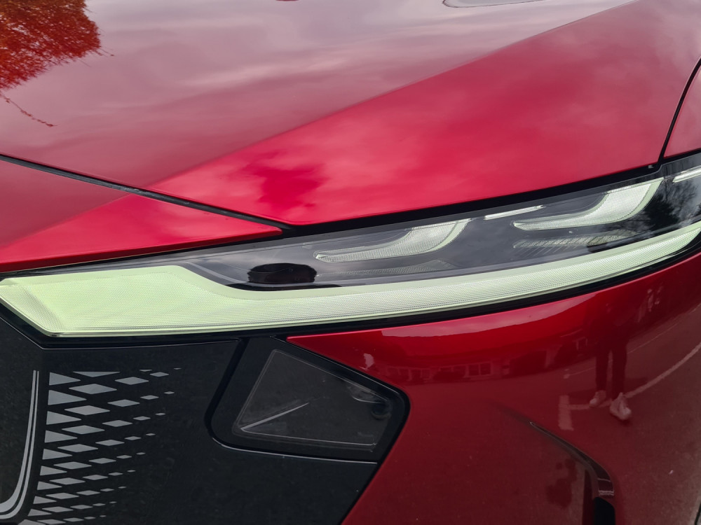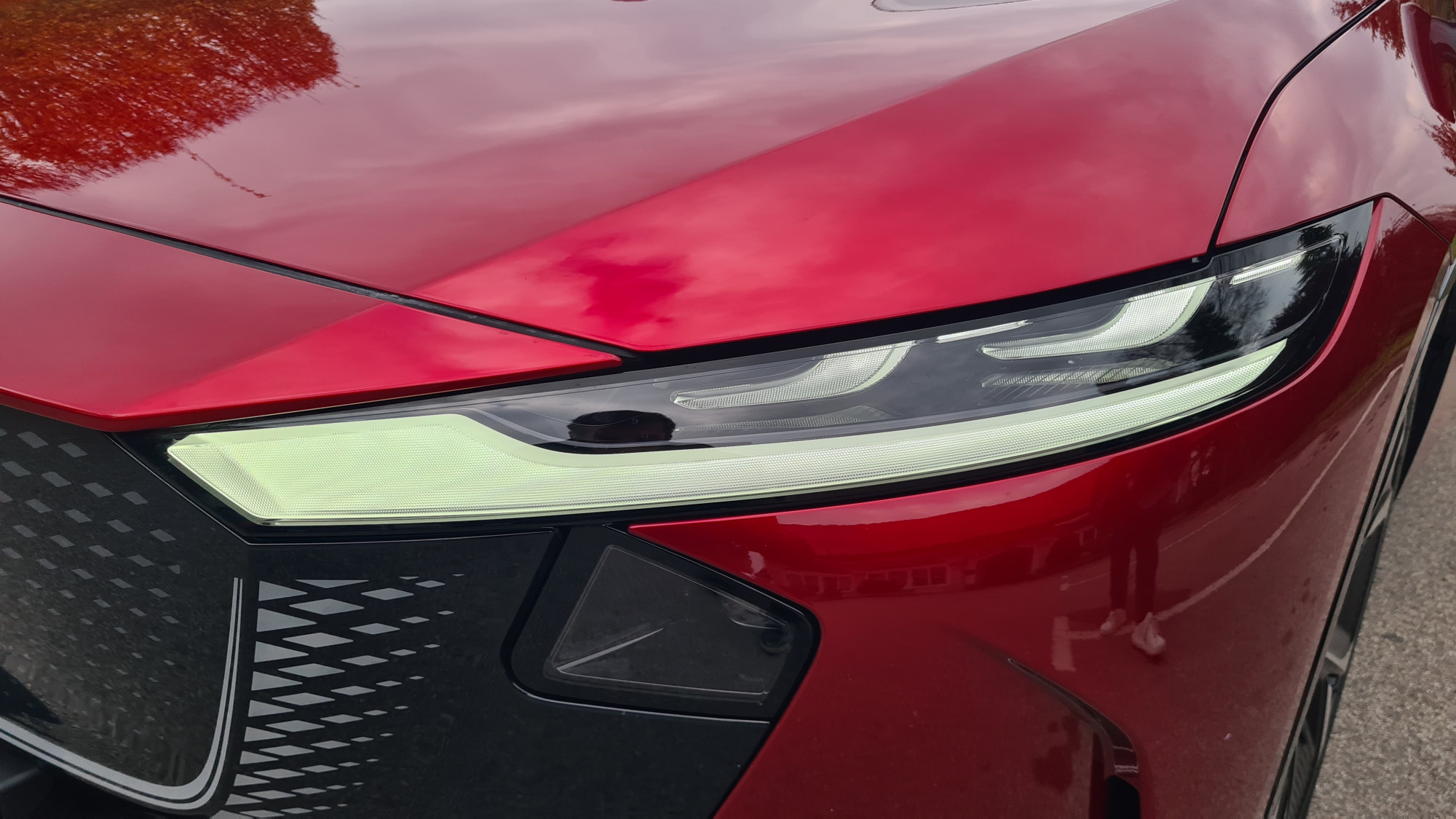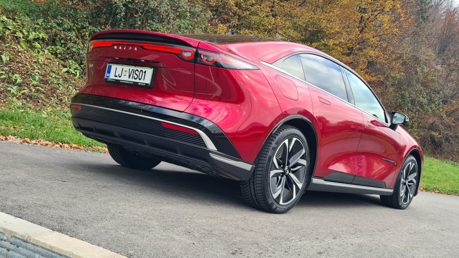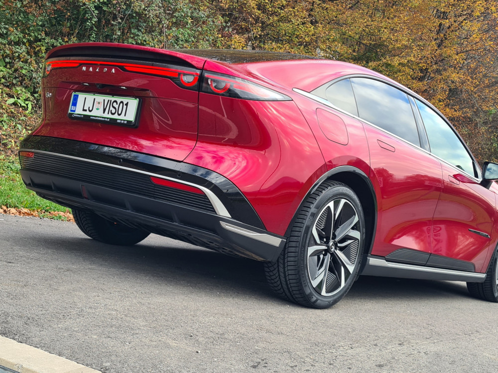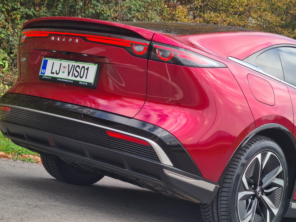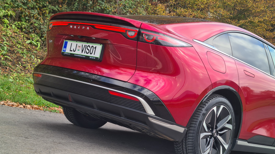 Na vrhu odsekanega zadka, nad žarometom se skriva aktivni spojler, ki se izvleče nad hitrostjo 90 kilometrov na uro. ''Inženirji pravijo, da pri velikih hitrostih poveča doseg za kakšen kilometer, prvotno pa gre za posebnost, ki nas loči od tekmecev,'' je povedal vodja prodaje Luka Namar. Da ni povsem klasična limuzina oziroma štirivratni kupe, namiguje s potopnimi kljukami ter prtljažnimi vrati, s katerimi se odpira tudi zadnje steklo.