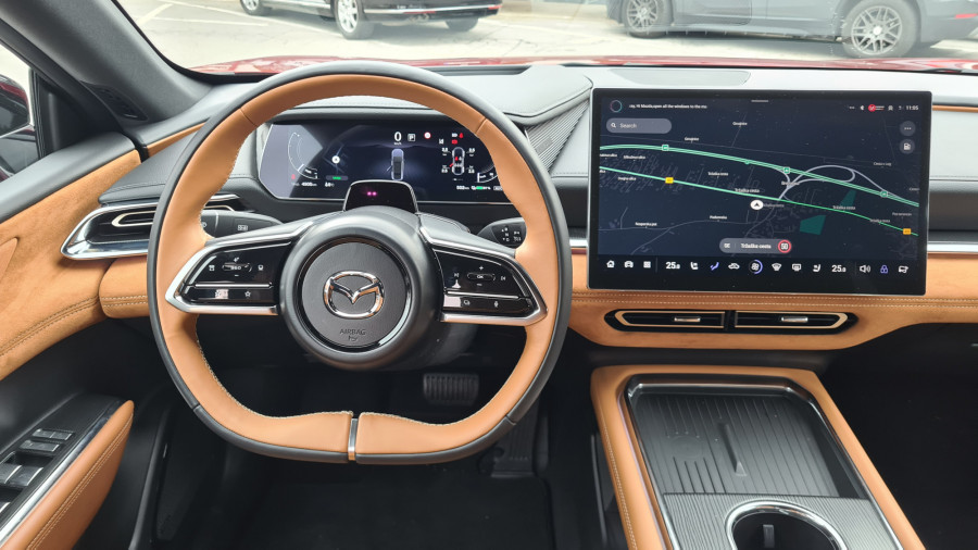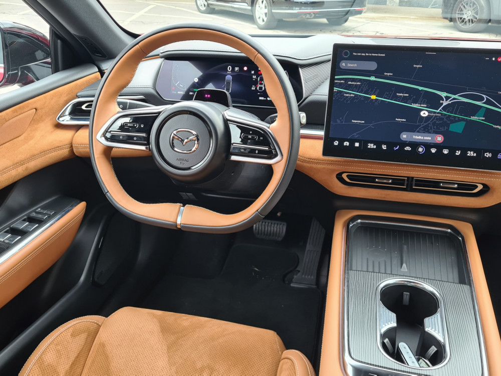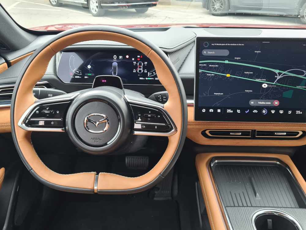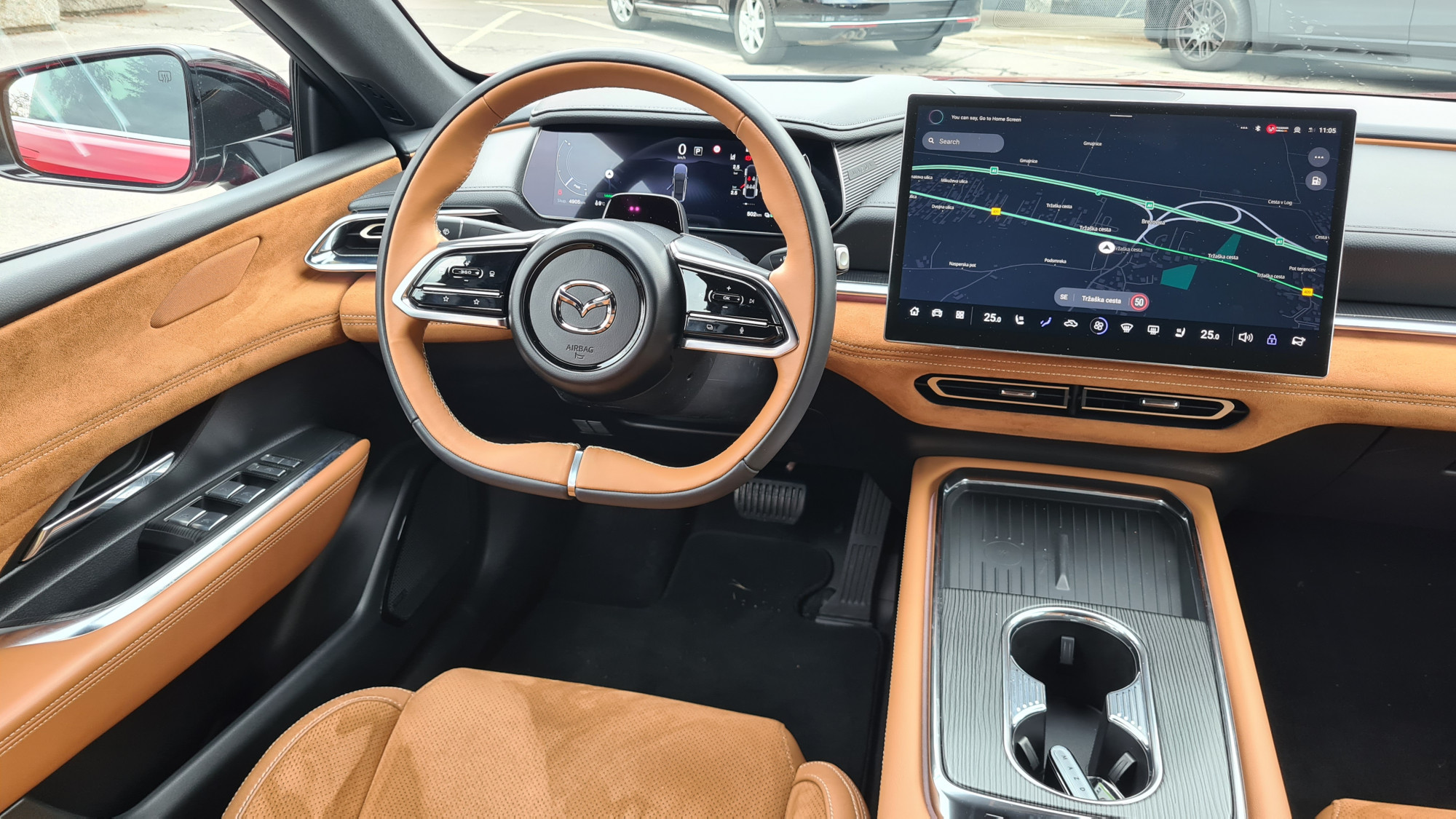 Kabina preseneti tako pozitivno kot negativno. Sama izdelava se mi je na kratki vožnji zdela dobra, še bolj zanimiva izbira materialov in barv. Po ergonomski postavitvi je notranjost povsem netipična za mazdo. Namesto diskretno postavljenega zaslončka na armaturi in vrtljivega stikala med sedežema je na sredini armaturne plošče zdaj velik zaslon na dotik. Požrl je vsa stikala in še ročico za brisalce.