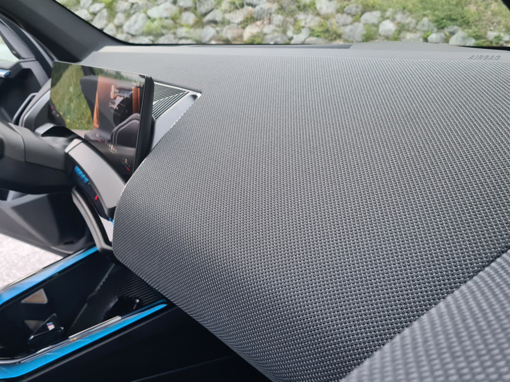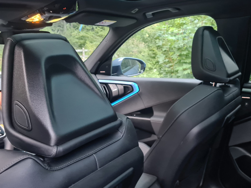 Ponekod izbira materialov kar malce šokira. Trda plastika, ki bi jo pričakoval v avtu za precej manj denarja. Kolega je pripomnil, da ga material, v katerega so oblekli armaturno ploščo in vrata, spominja na minija. Svetla točka ostajata izdelava ter dejstvo, da nekaterih cenenih delov morda ne boste opazili takoj. Najbolj zmotijo plastika na notranji kljuki, držalo na vratih ob stikalih za odpiranje oken in hrbtišče vzglavnikov … Vtis malce popestri osvetlitev, ki se spreminja z izbiro voznih programov ali pa seveda po željah potnikov.
