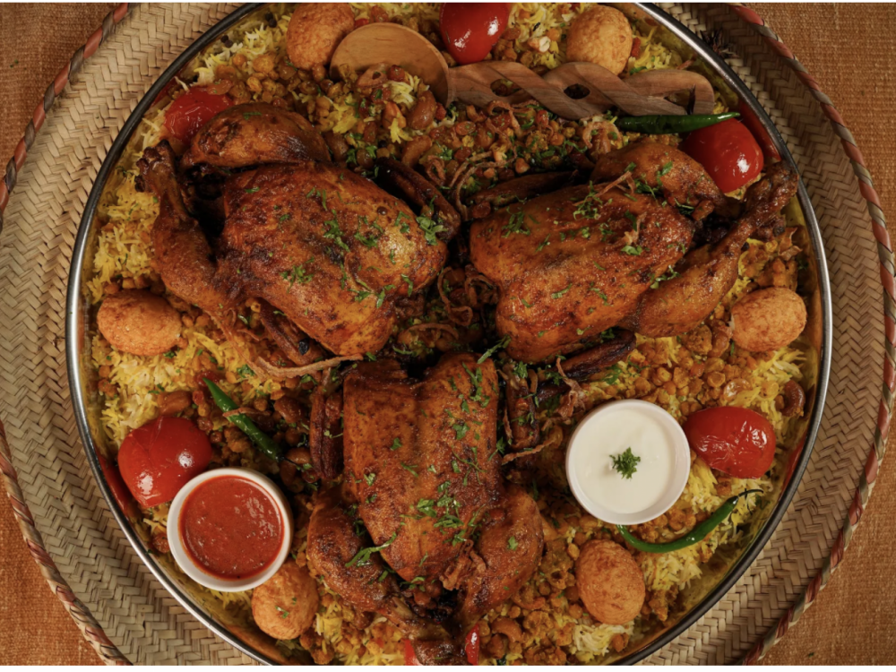 Na meniju so tradicionalne jedi, kot so emiratski jagnječji thareed (90 AED) – počasi kuhano meso in zelenjava z začimbami – ter okusni prawn biryani (110 AED). Na voljo so tudi manjši grižljaji, kot palestinska musaka s piščancem (60 AED) in bahrajnski loomi kebab (90 AED). Alkohola ne strežejo, ponujajo pa domiselne brezalkoholne koktajle, kot sta desert rose (55 AED) in hladen hibiskusov čaj (35 AED). Priljubljen je tudi lokalni čaj karak (15 AED), odišavljen s cimetom in kardamomom.