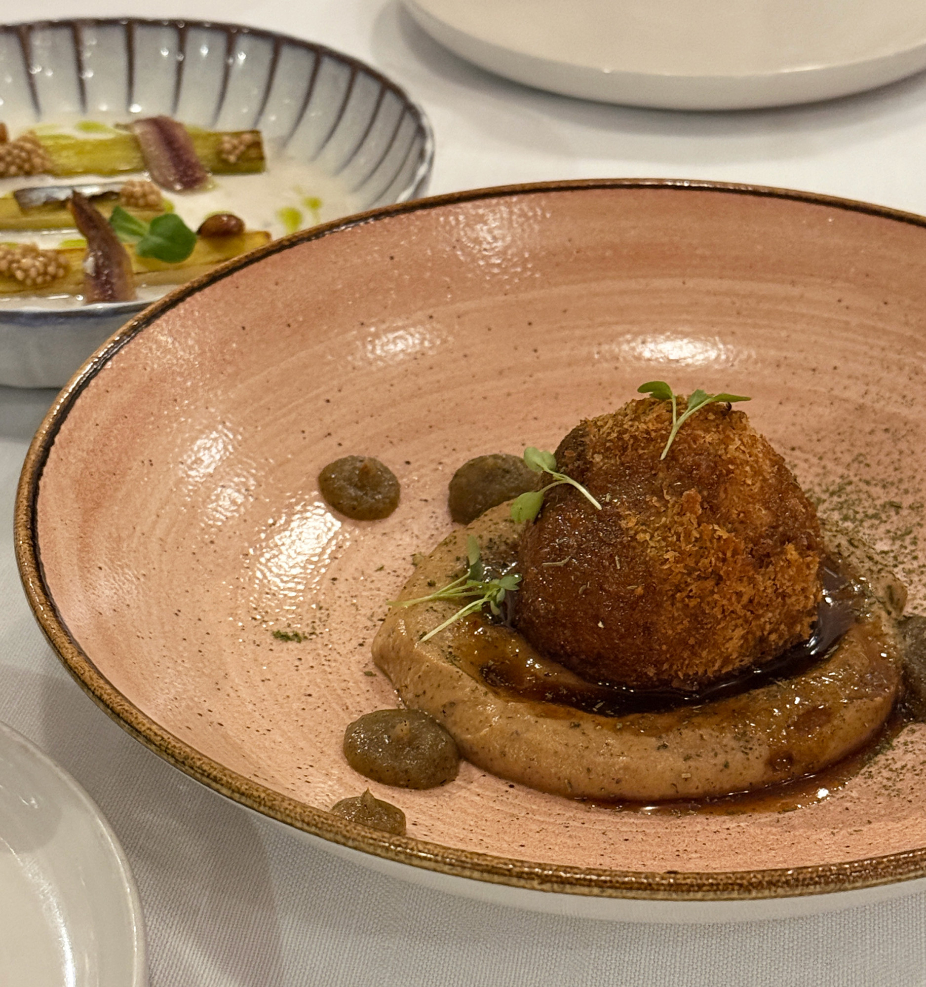 Meni je kratek in sezonski. Najbolj priljubljene jedi se rotirajo, vključno s pluma pata negra (51 CHF), vrhunski kos Iberico svinjine z osvežujočo teriyaki omako. Pred tem poskusite duck cromesqui (24 CHF), elegantno kroketko na pireju iz cvetače in jabolka – nenavadno, a uspešno. Še eno priljubljeno predjed je rižota iz zelene z dodatkom tartufov in foie gras (24 CHF).