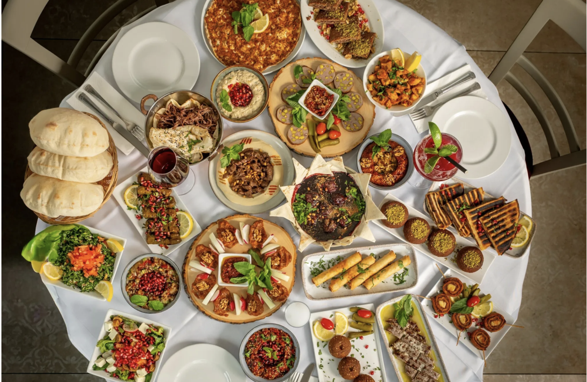 Obrok v Cadmusu spominja na zajtrk v severnosirskem Alepu na miren dan, ko so svetli restavracijski prostori polni družin, mize pa prekrivajo kebabi in pisani meze krožniki.