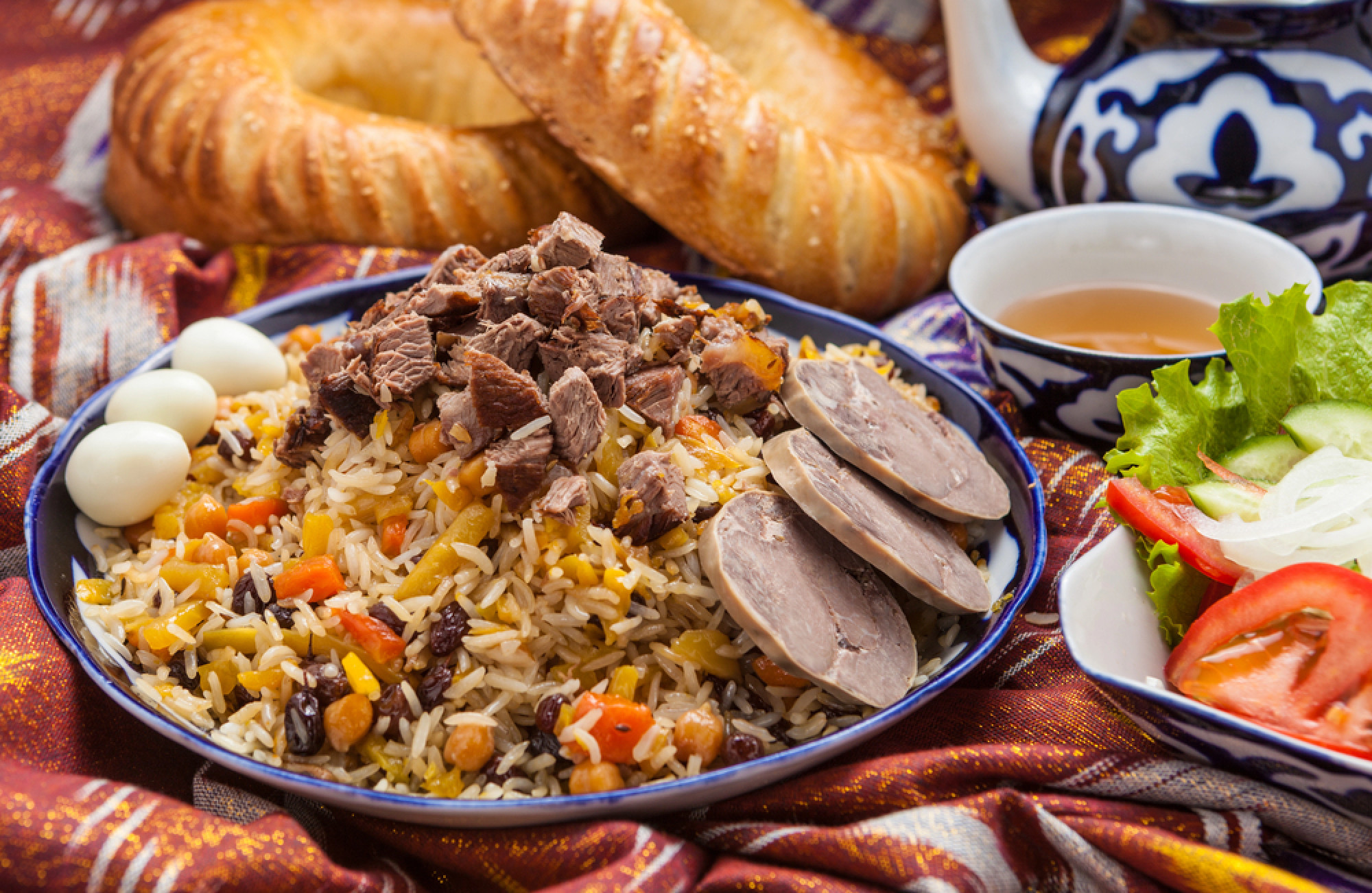 Uzbekistanski plov (podobno kot pilaf) serviran na adrasu – tradicionalni uzbekistanski ročno tkani tkanini iz svile in bombaža, znani po živahnih ikat vzorcih in trpežnosti. Foto: Depositphotos