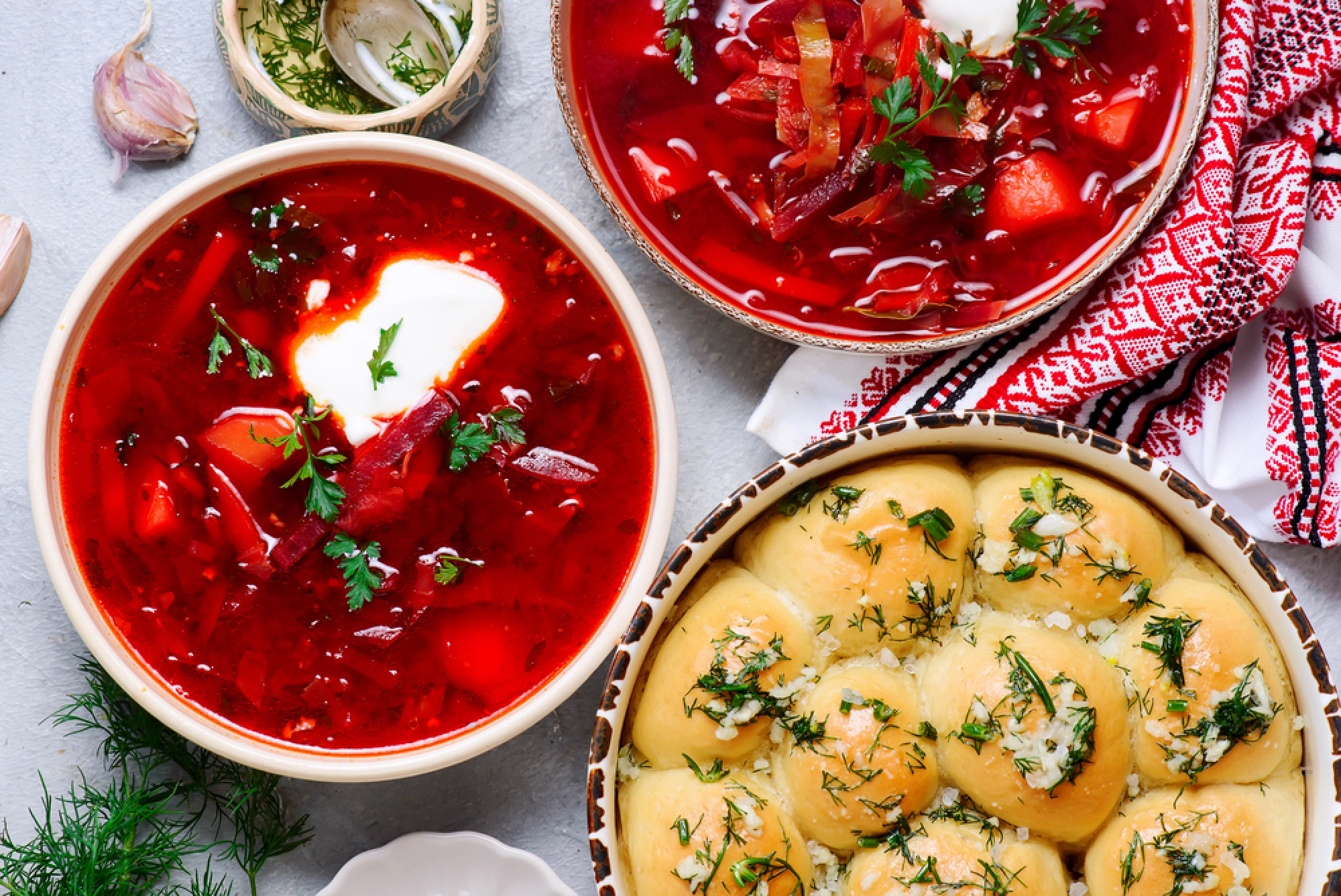 Ukrajinski boršč, serviran s pampuški (ukrajinske česnovke). Foto: Depositphotos