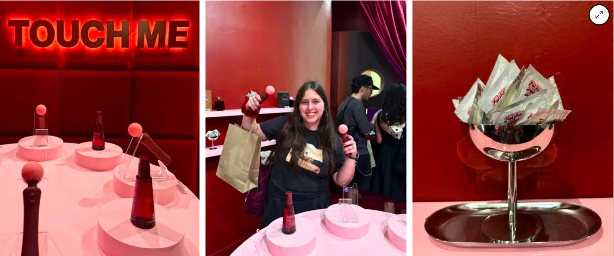 Na sredini prostora je na stojalu stal krog vibratorjev, skoraj kot bi bili novi modeli pametnih telefonov v trgovini. Prvih deset minut se prva skupina kupcev ni upala dotakniti izdelkov. Šele ko je zaposleni pojasnil, da so izdelki funkcionalni in interaktivni, so jih kupci začeli raziskovati.