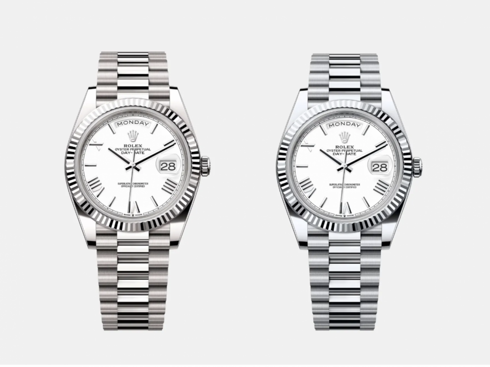 Na levi strani je Rolex Day-Date iz belega zlata, premer 40 milimetrov, model 228239, maloprodajna cena znaša 51.600 dolarjev. Na desni strani je Rolex Day-Date iz platine, prav tako premera 40 milimetrov, model 228236, maloprodajna cena 68.800 dolarjev.